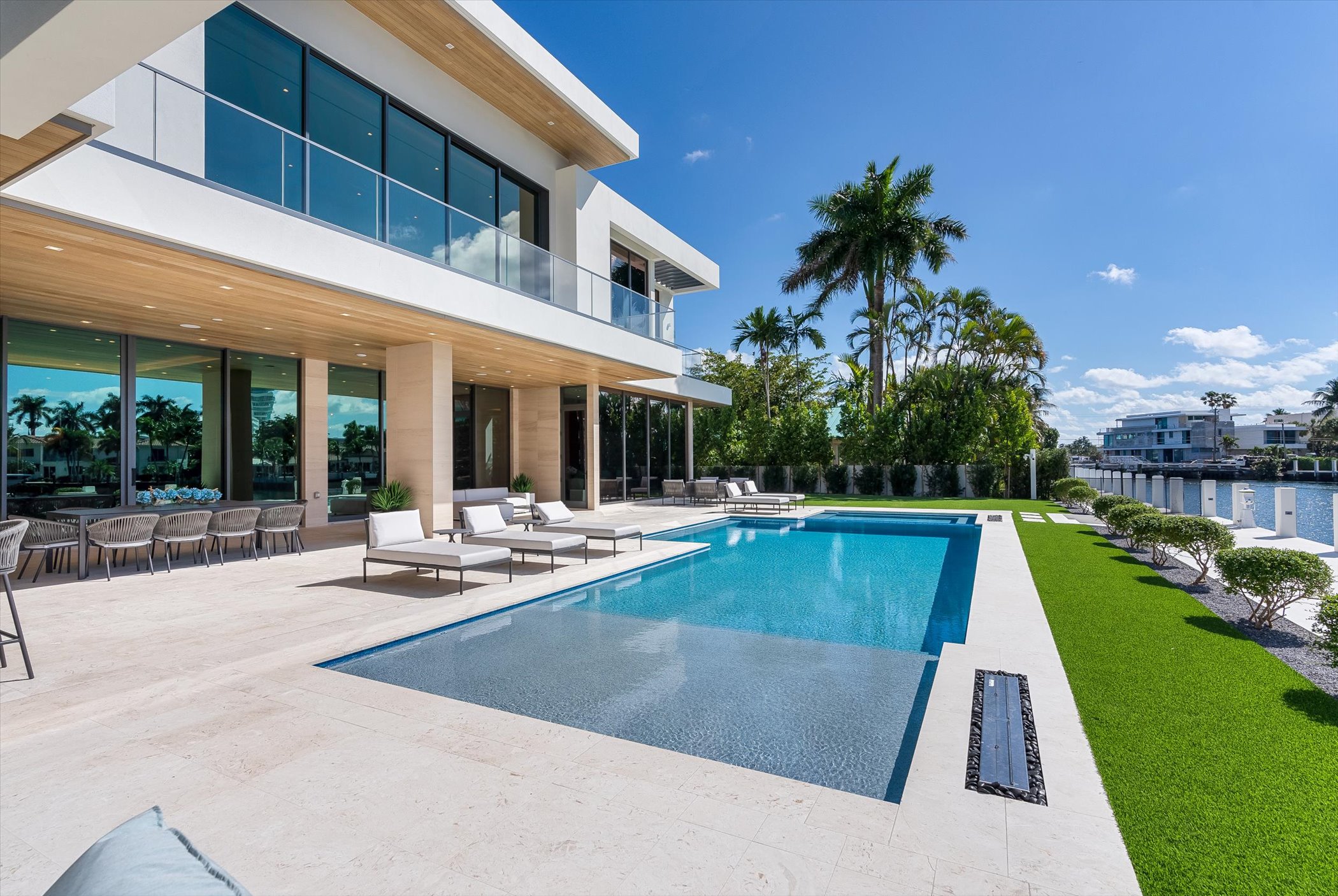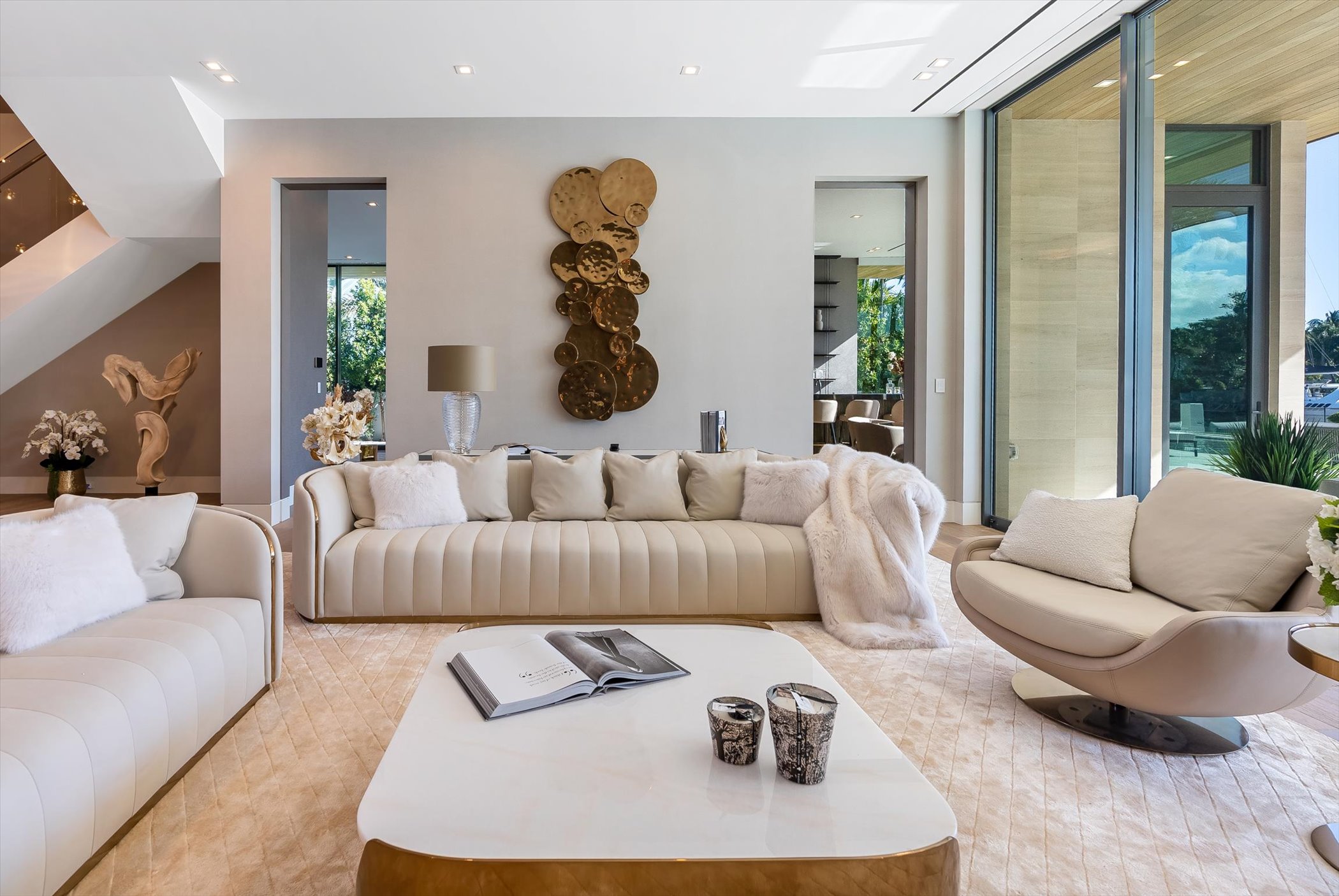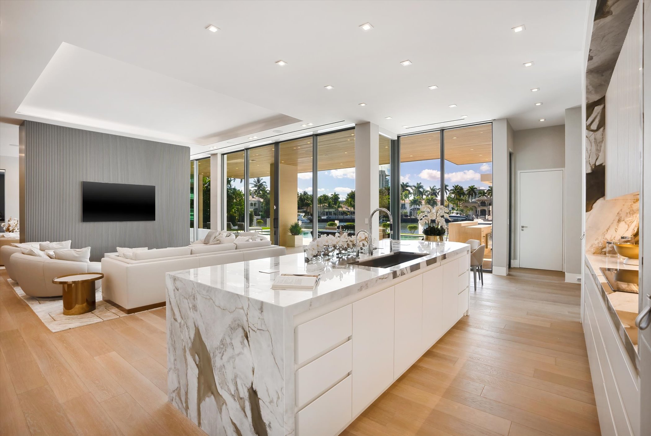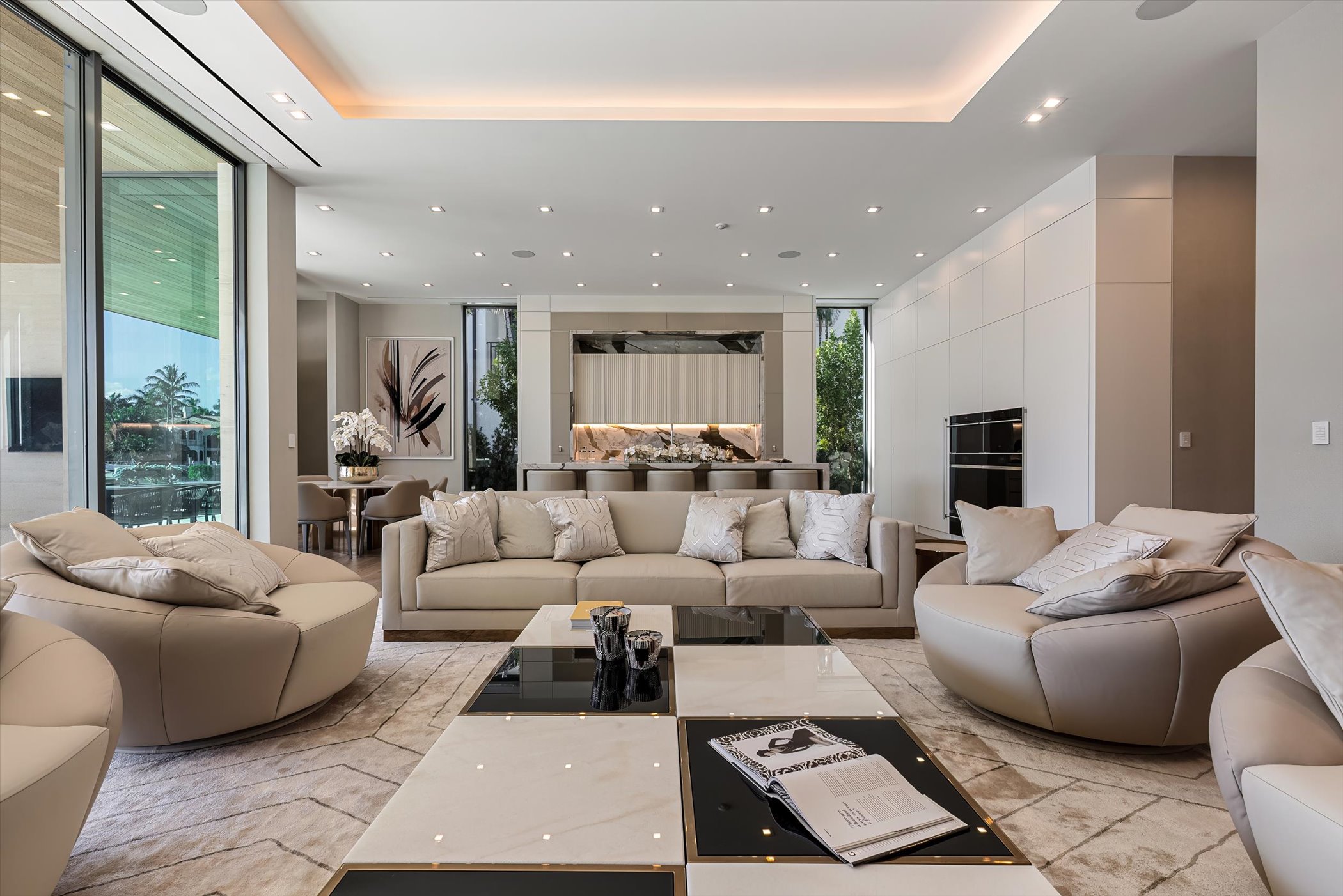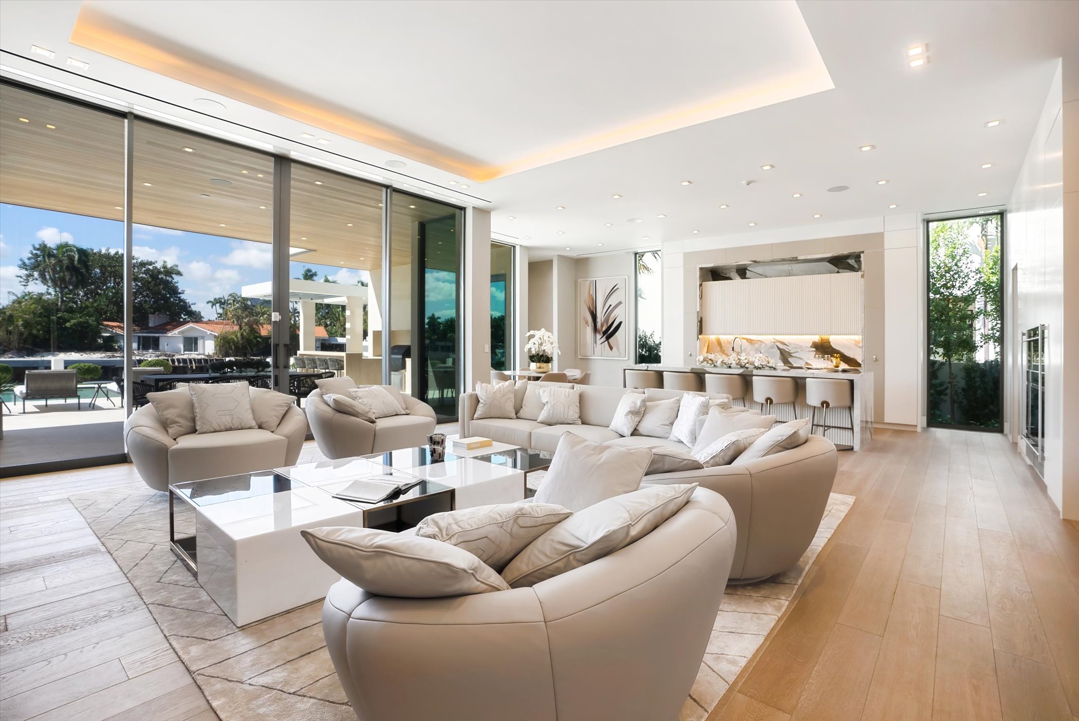 The open-concept layout integrates elegant entertaining spaces, including a sleek kitchen and floating staircase, framed by expansive glass walls connecting to outdoor terraces, a geometric pool, and spa. The property also offers 110 feet of deep-water dockage, perfect for mega yacht access, completing this refined waterfront lifestyle.