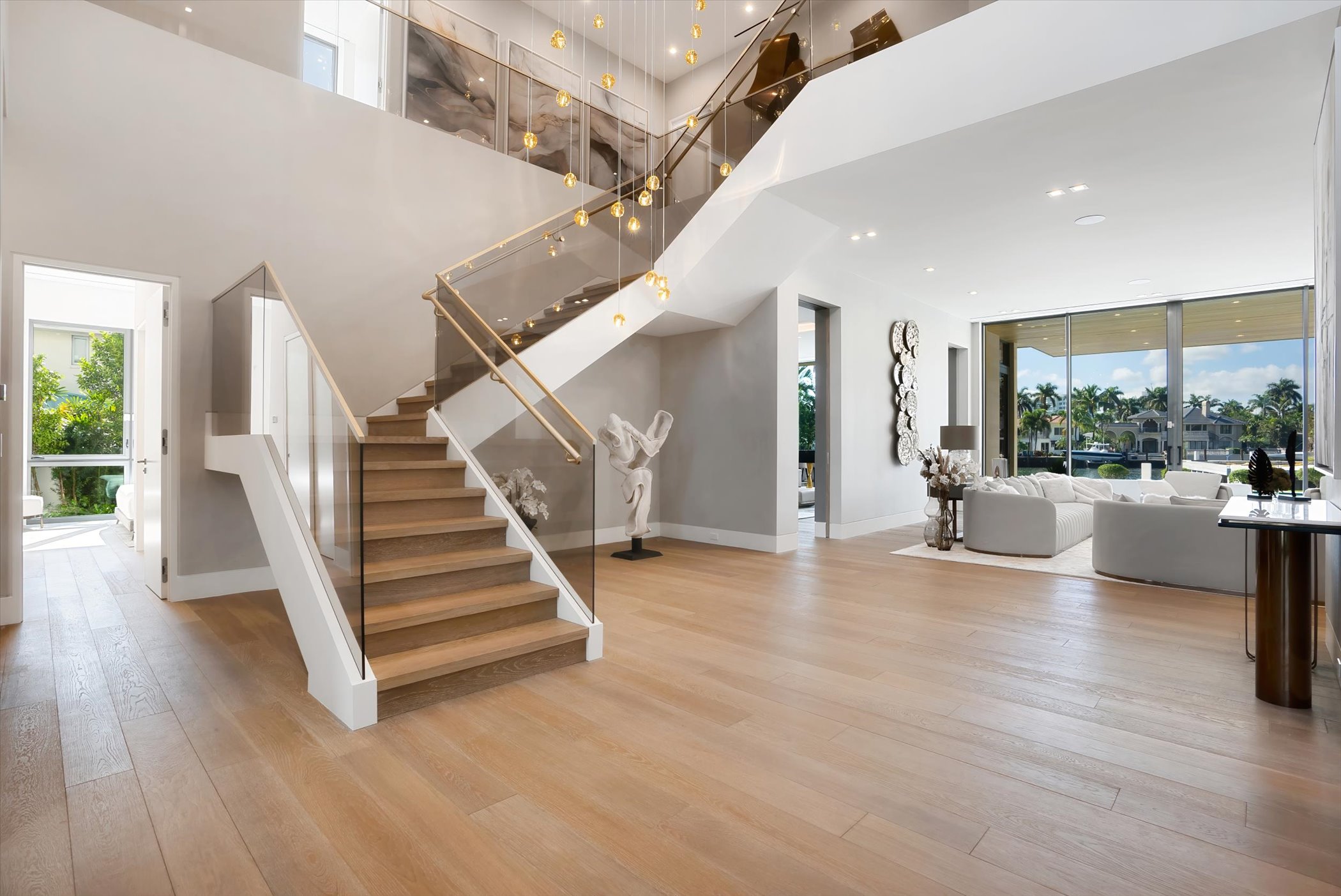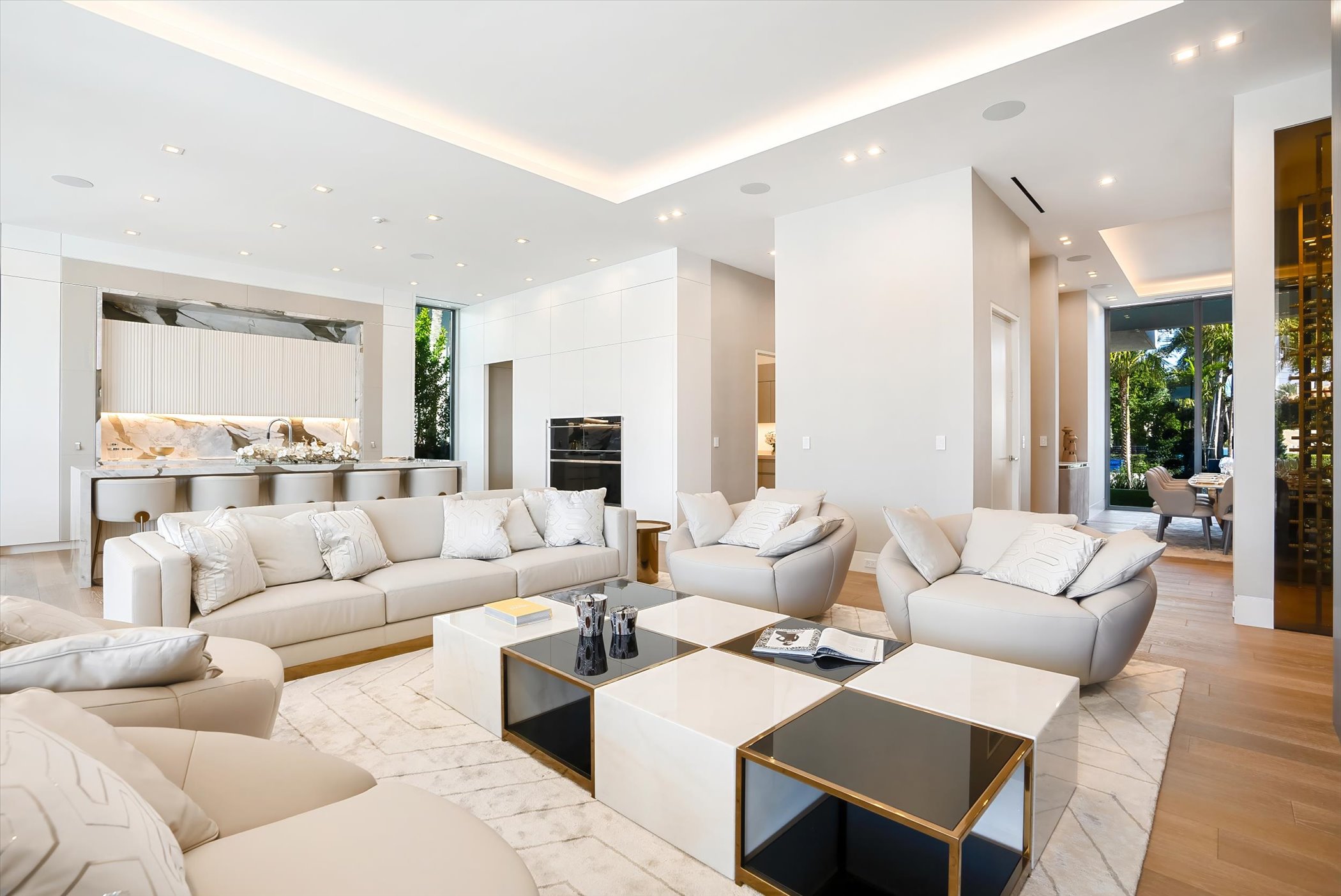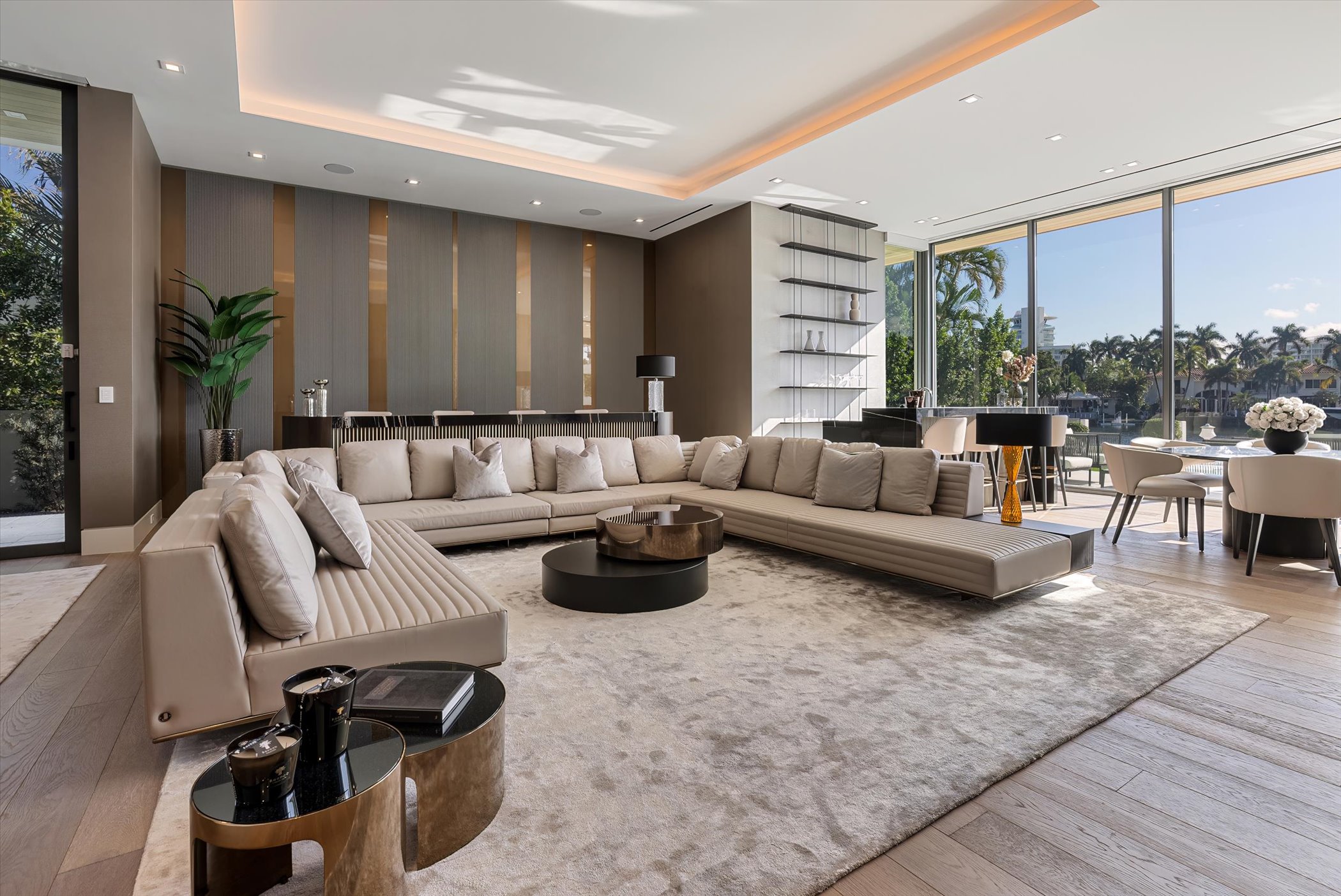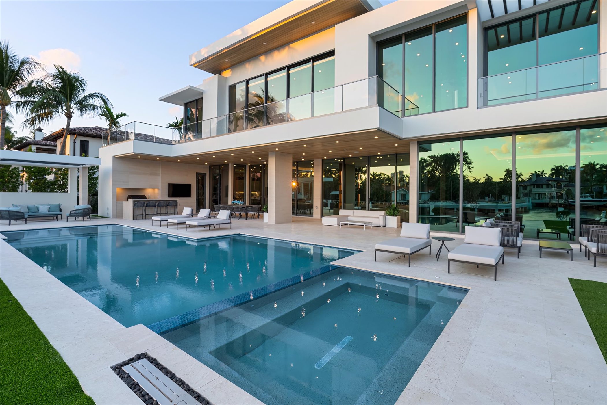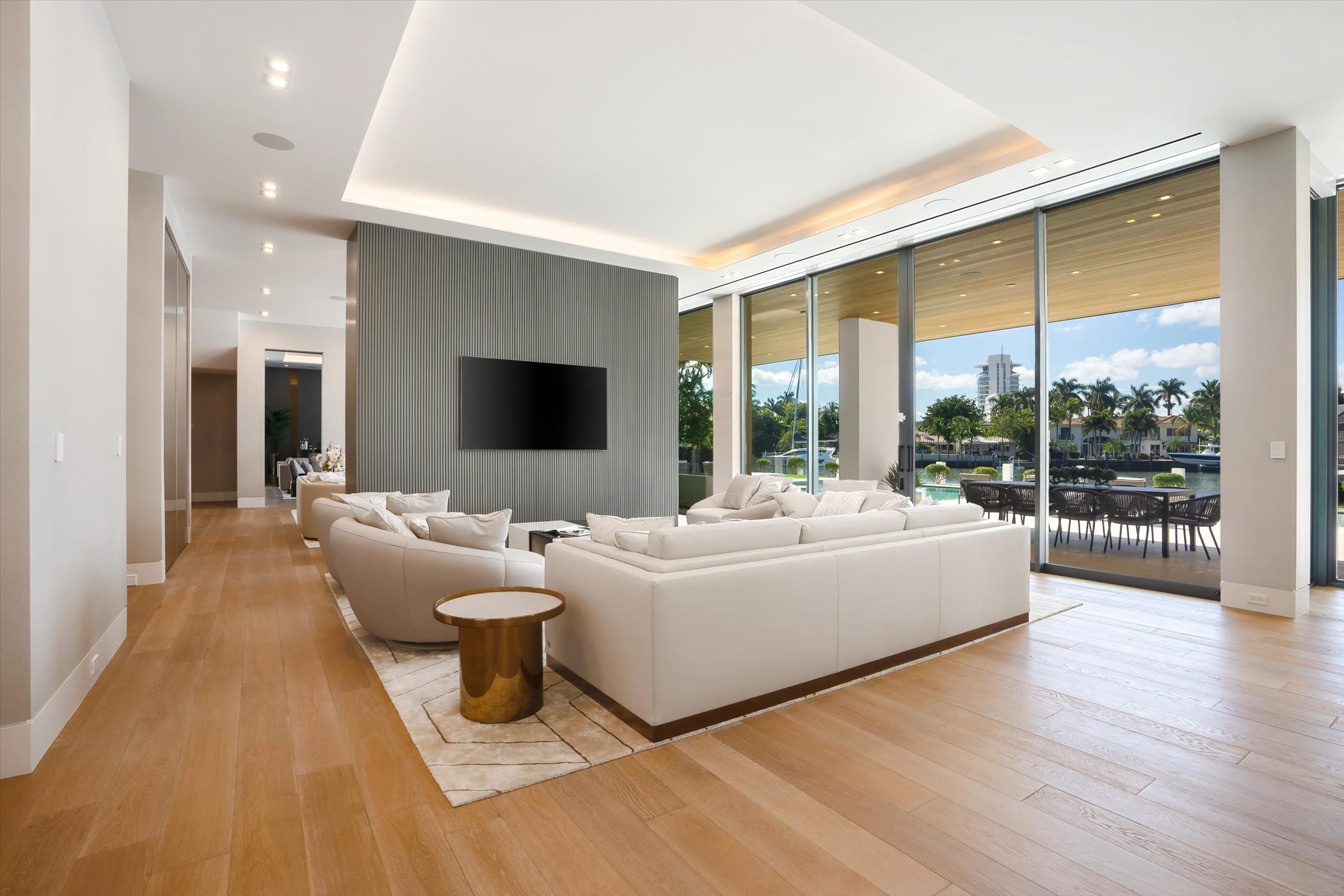 The open-concept layout integrates elegant entertaining spaces, including a sleek kitchen and floating staircase, framed by expansive glass walls connecting to outdoor terraces, a geometric pool, and spa. The property also offers 110 feet of deep-water dockage, perfect for mega yacht access, completing this refined waterfront lifestyle.