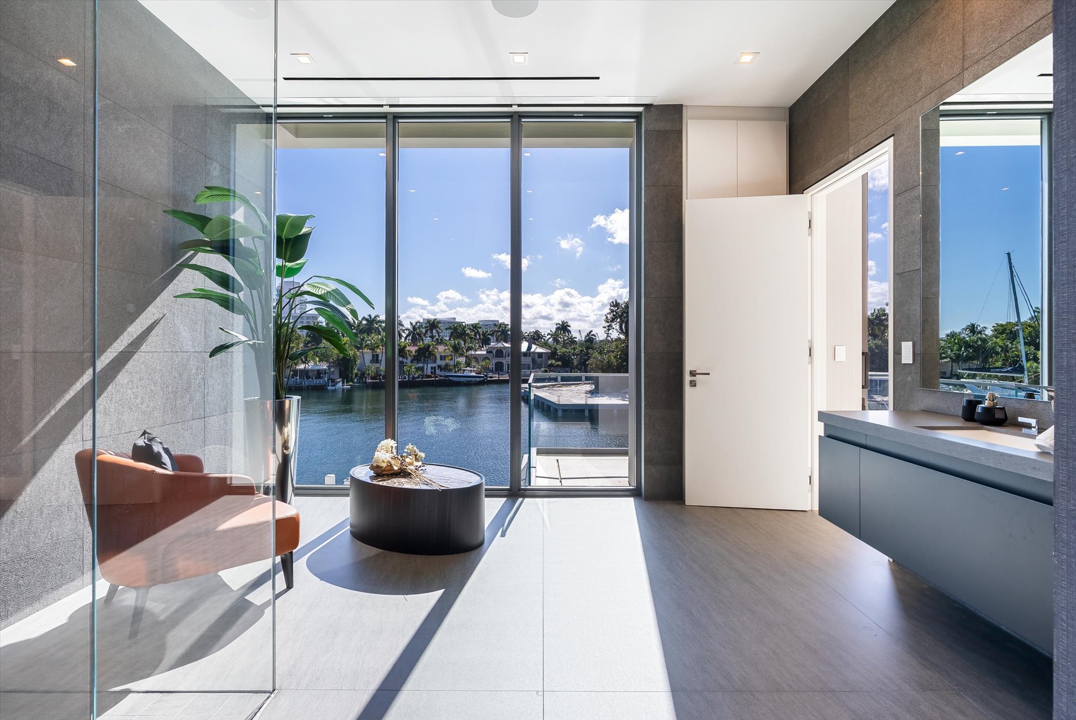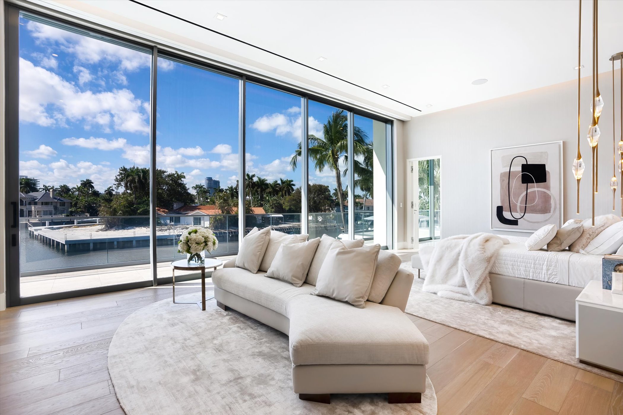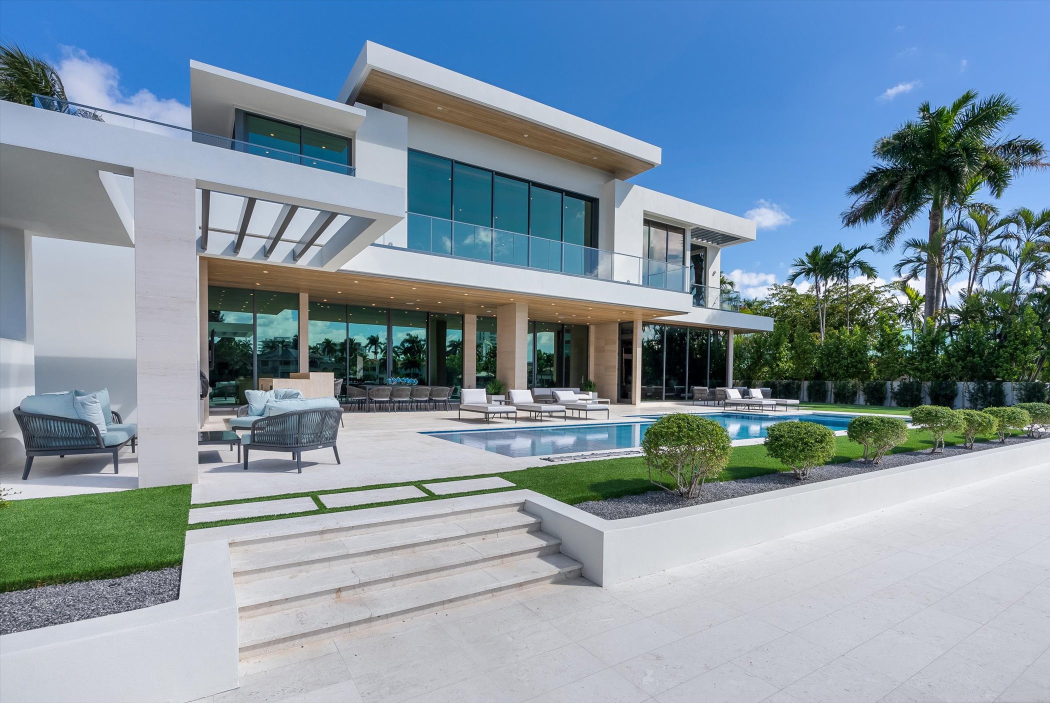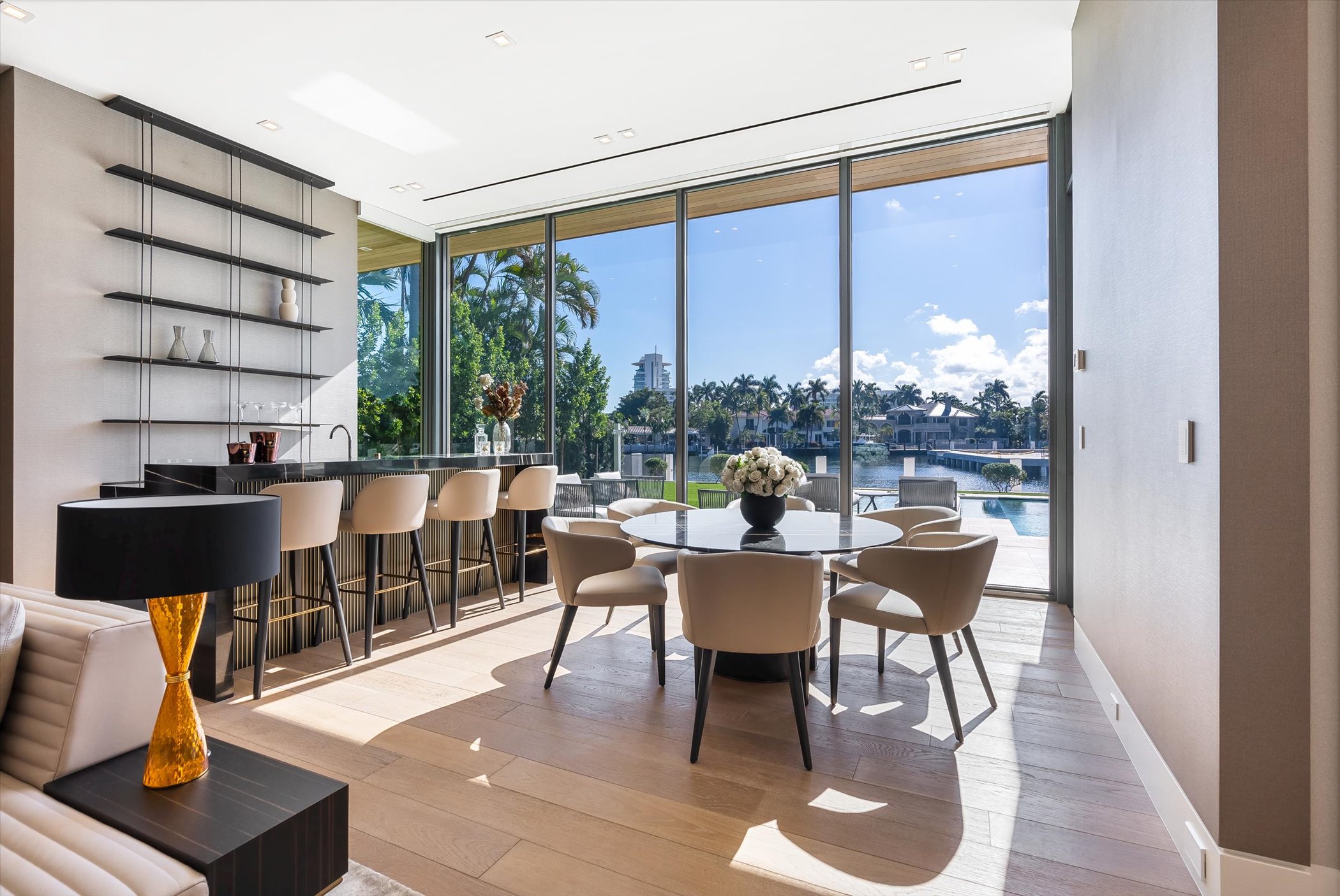 The open-concept layout integrates elegant entertaining spaces, including a sleek kitchen and floating staircase, framed by expansive glass walls connecting to outdoor terraces, a geometric pool, and spa. The property also offers 110 feet of deep-water dockage, perfect for mega yacht access, completing this refined waterfront lifestyle.