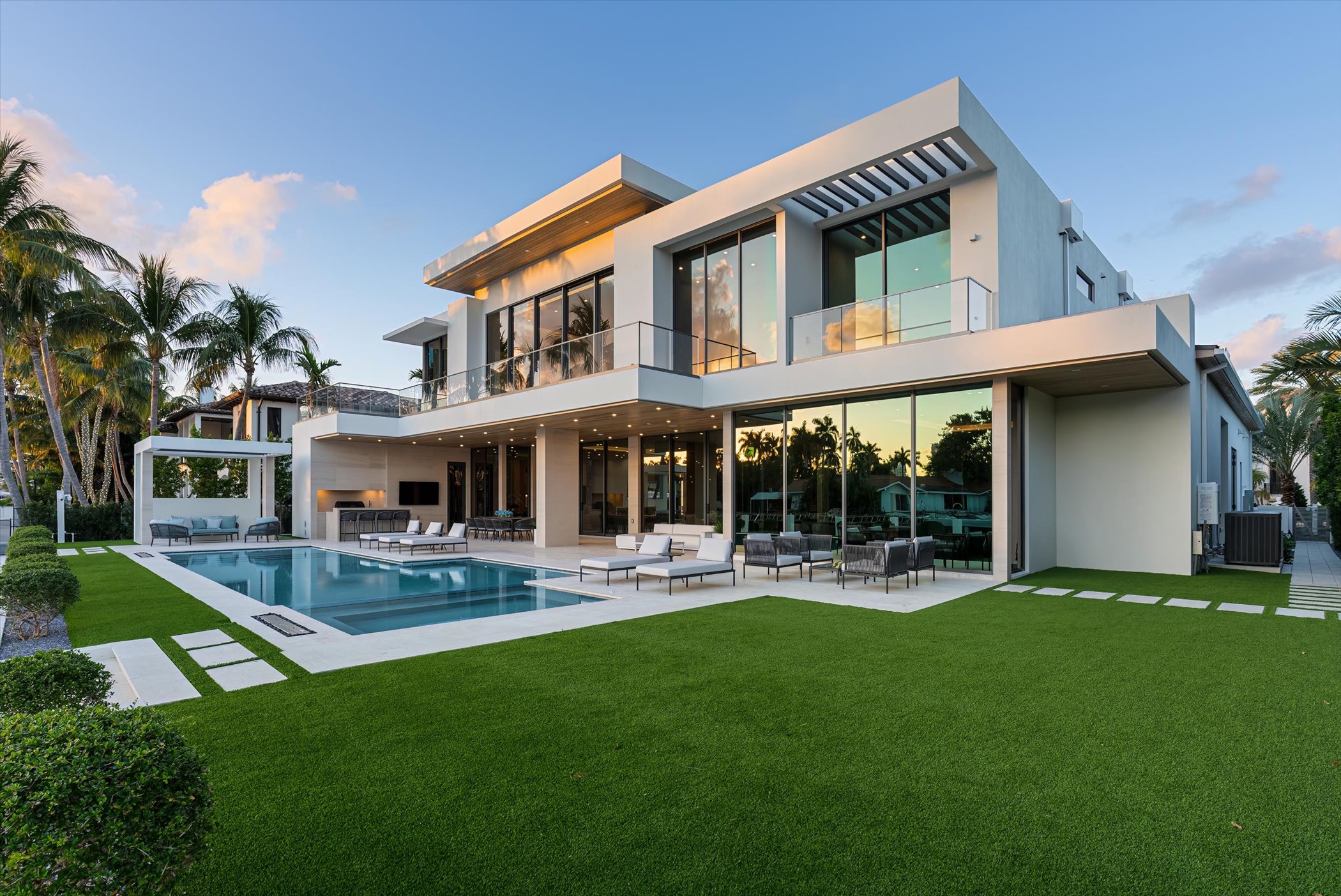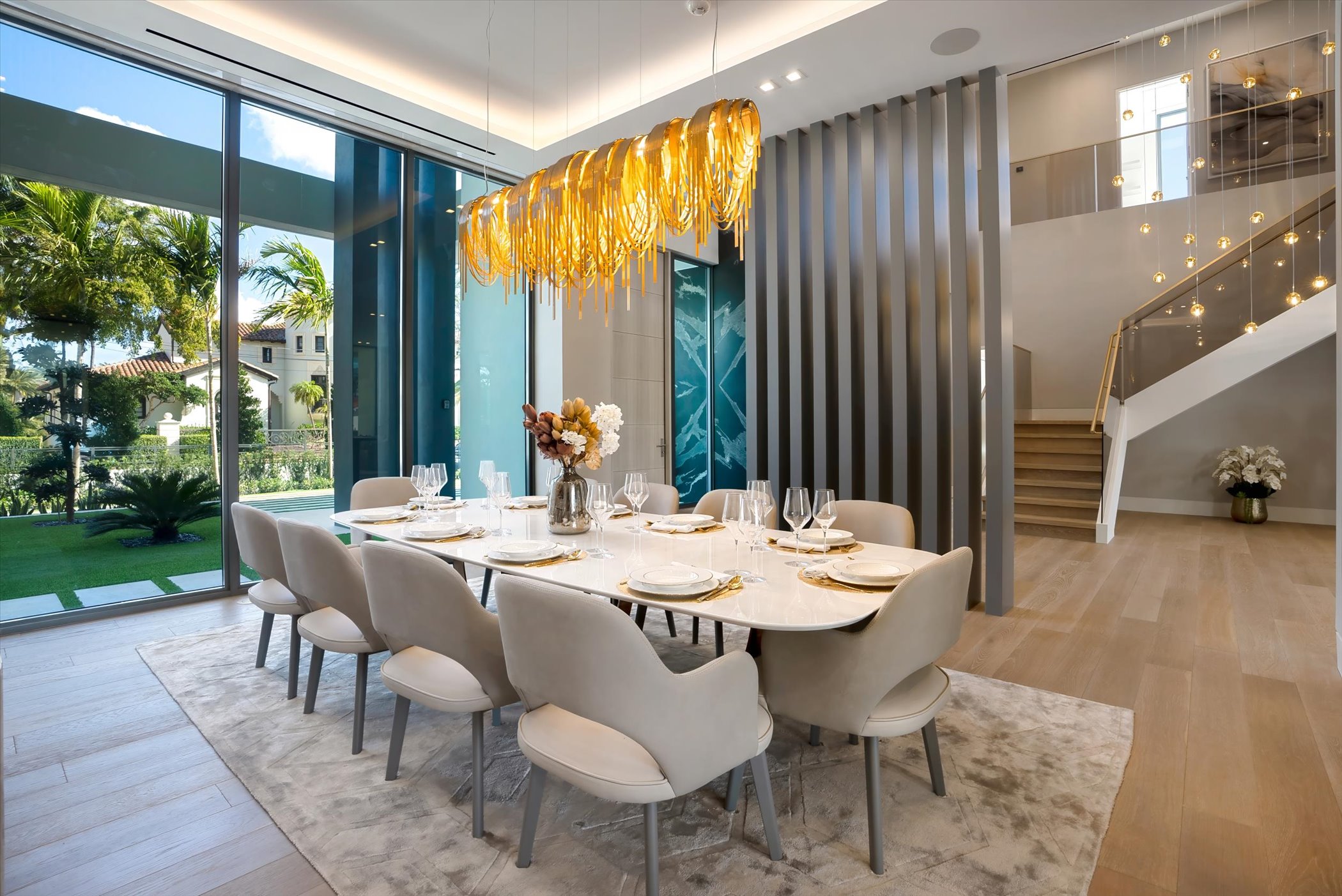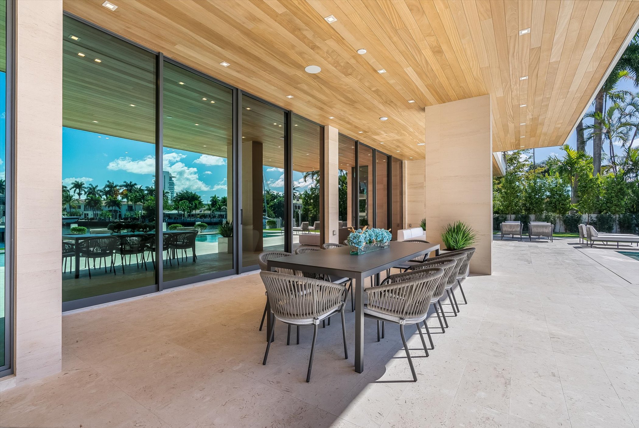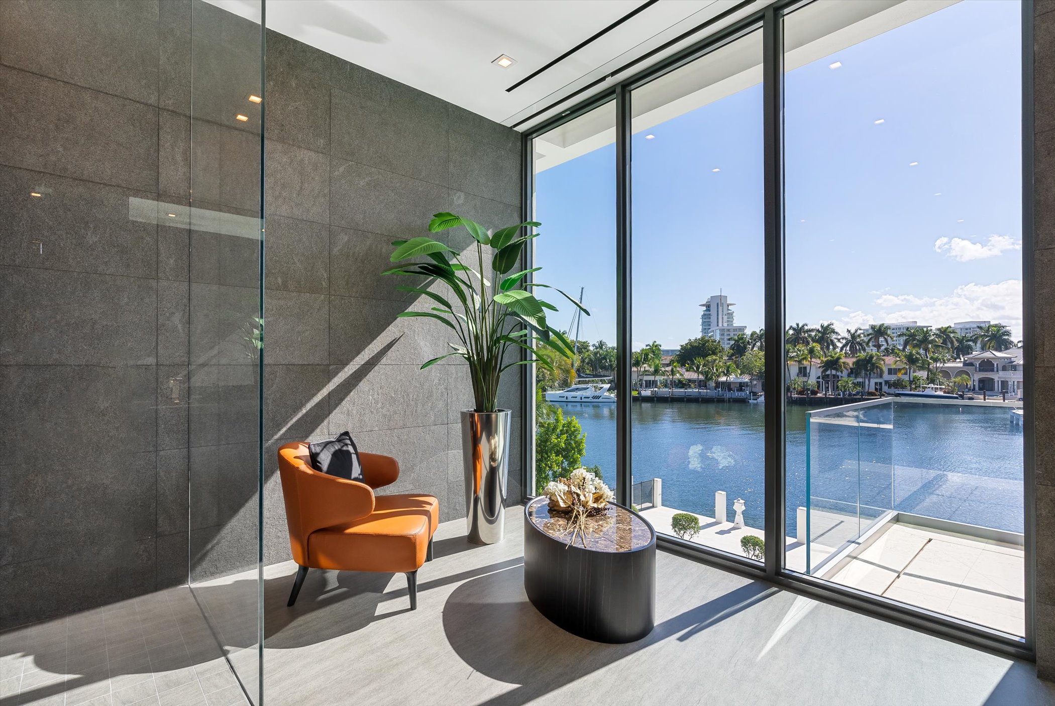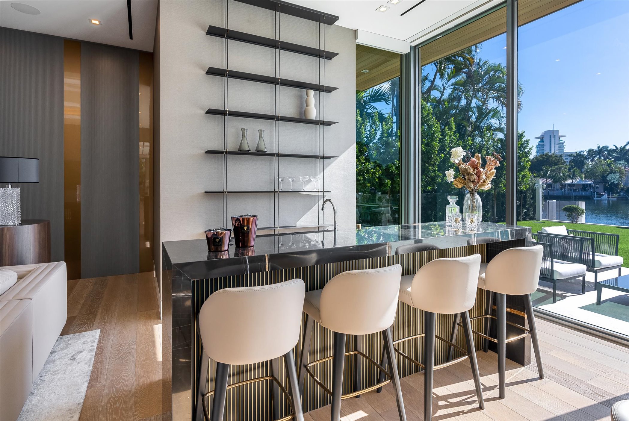 The open-concept layout integrates elegant entertaining spaces, including a sleek kitchen and floating staircase, framed by expansive glass walls connecting to outdoor terraces, a geometric pool, and spa. The property also offers 110 feet of deep-water dockage, perfect for mega yacht access, completing this refined waterfront lifestyle.