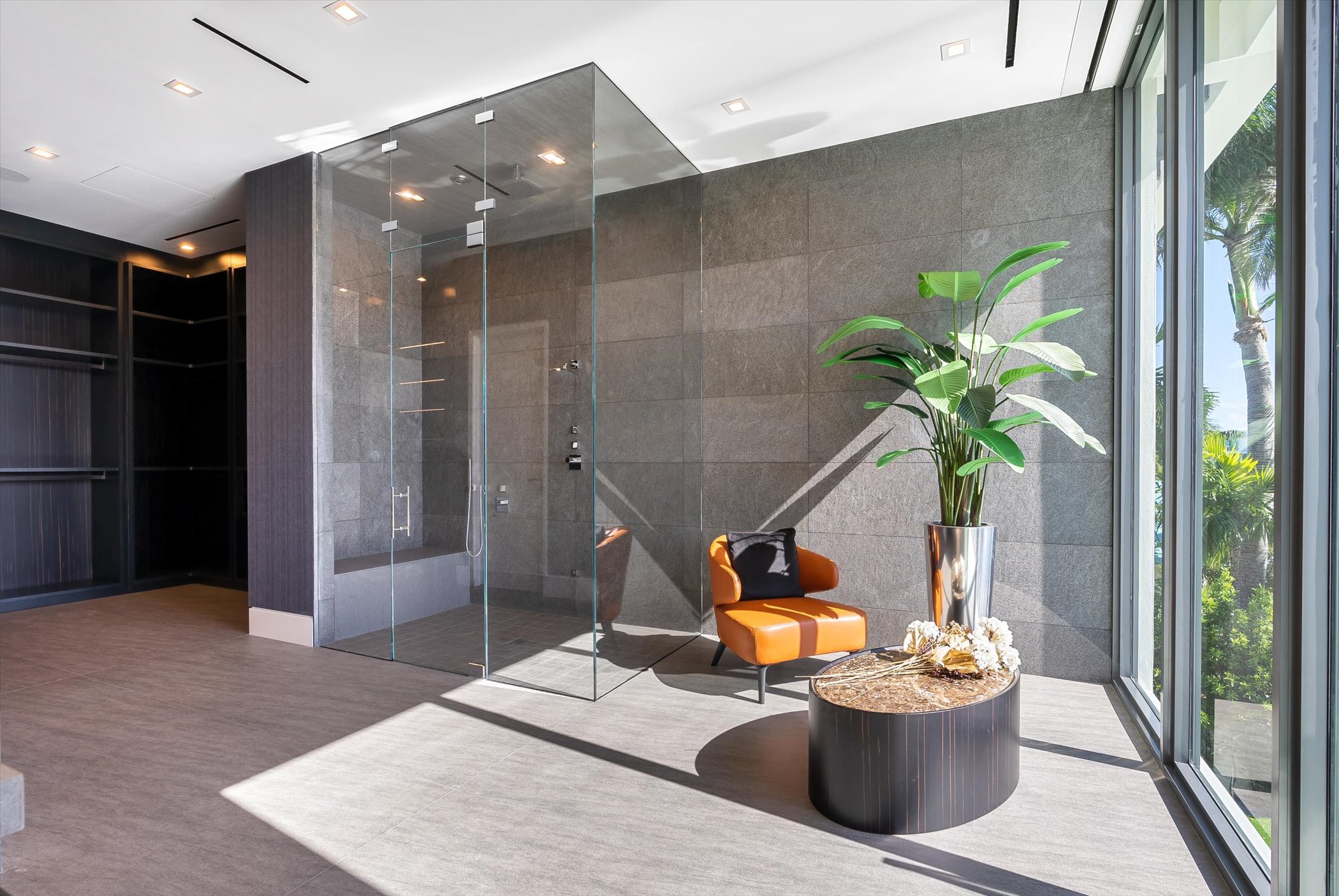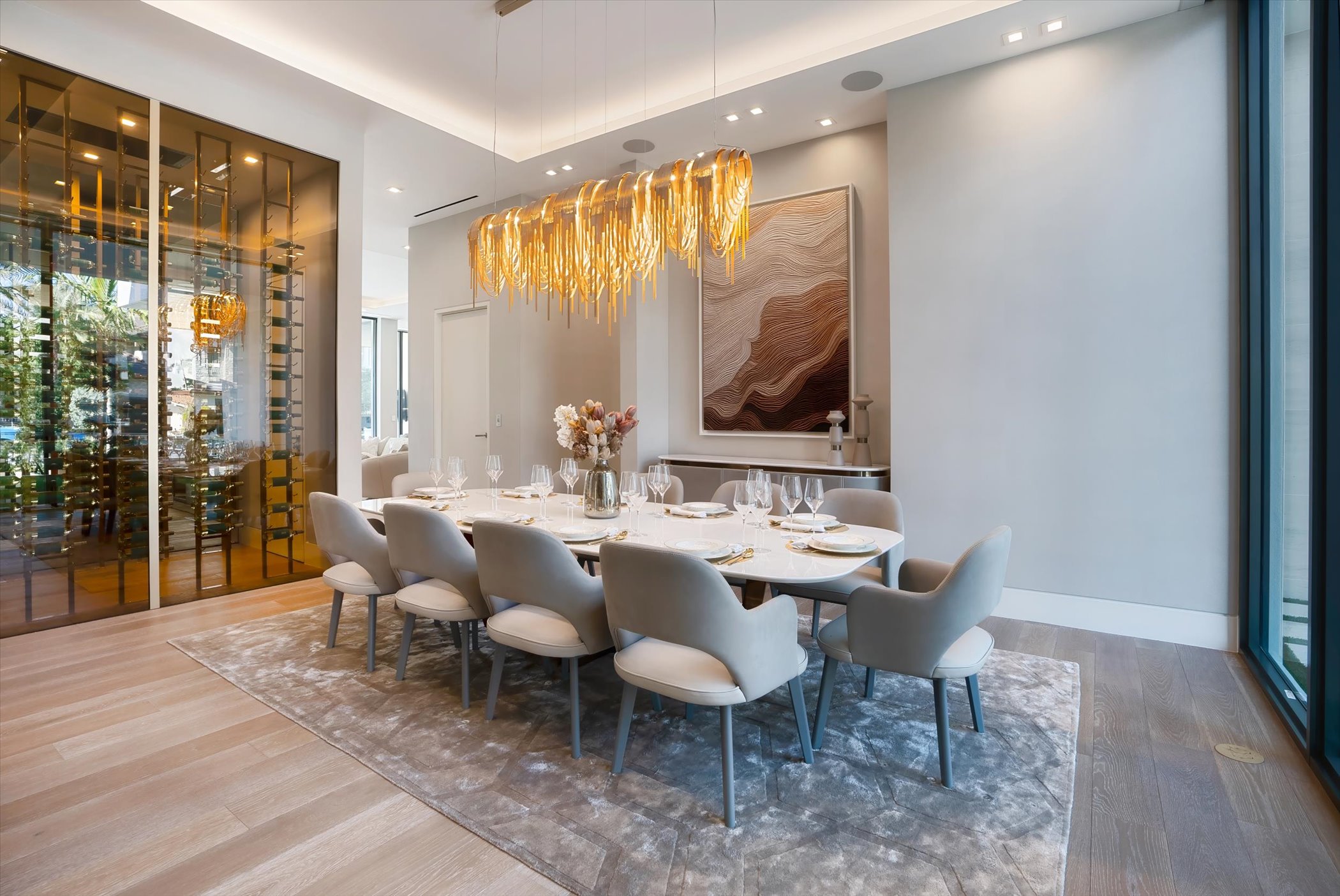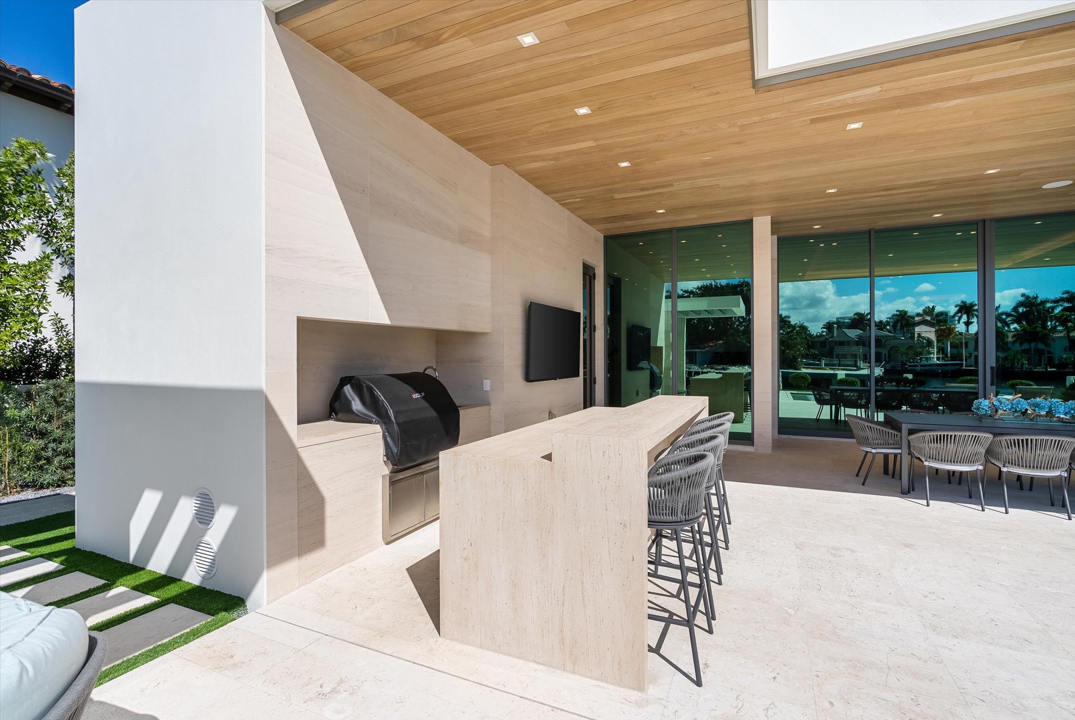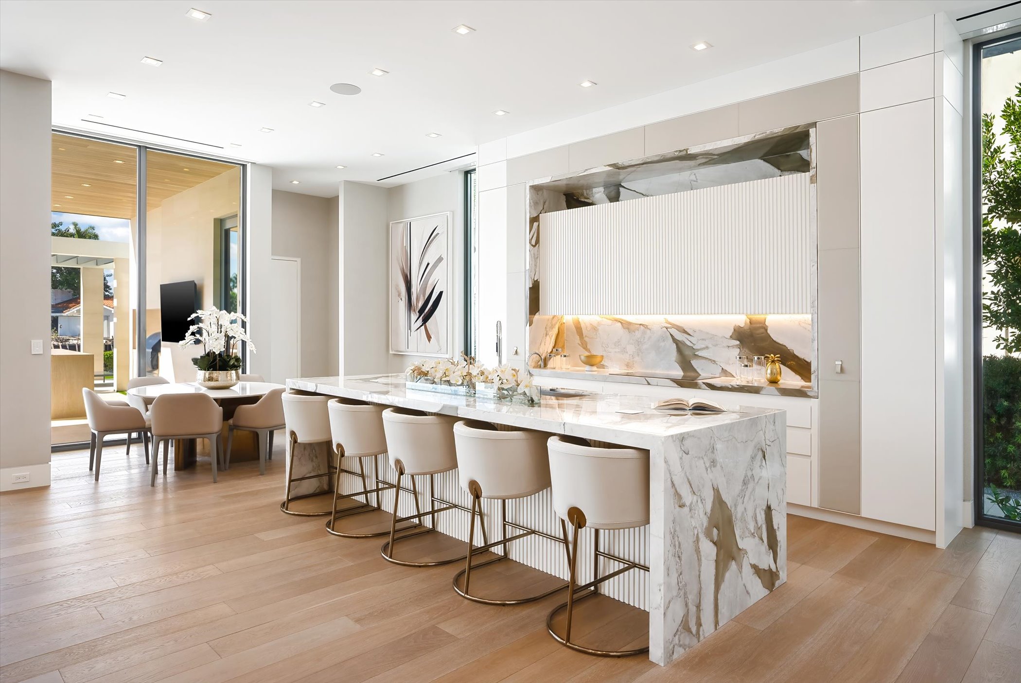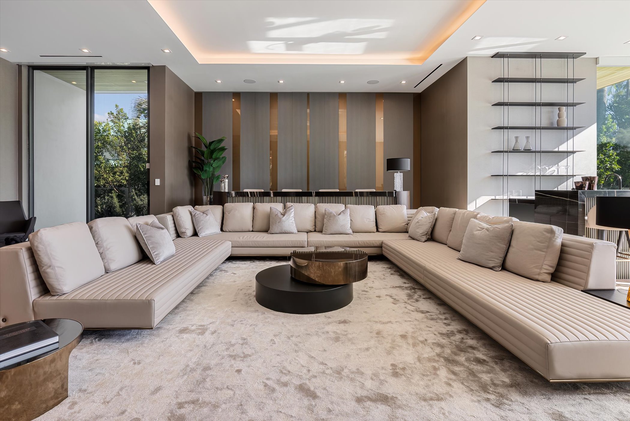 The open-concept layout integrates elegant entertaining spaces, including a sleek kitchen and floating staircase, framed by expansive glass walls connecting to outdoor terraces, a geometric pool, and spa. The property also offers 110 feet of deep-water dockage, perfect for mega yacht access, completing this refined waterfront lifestyle.