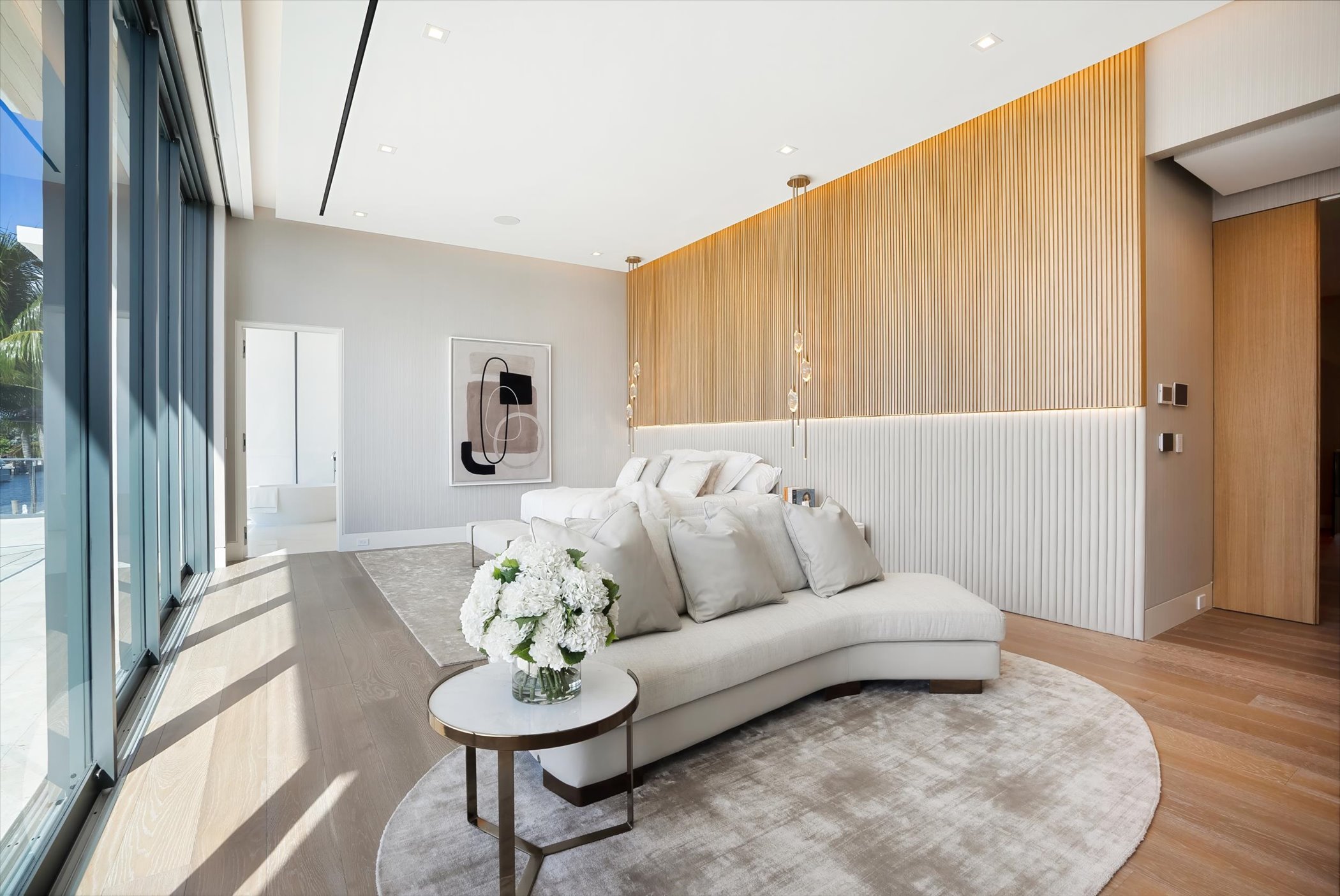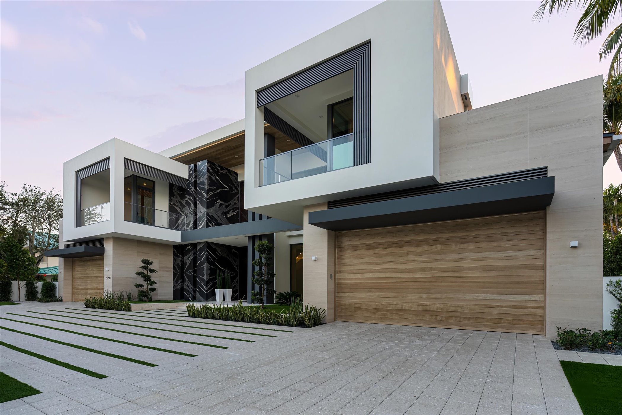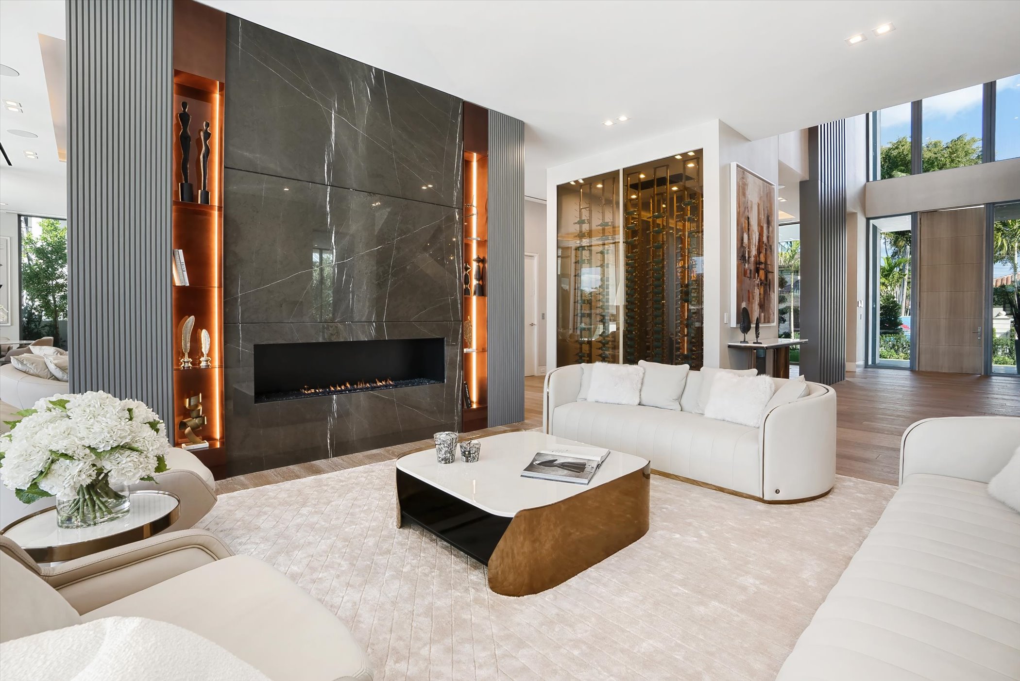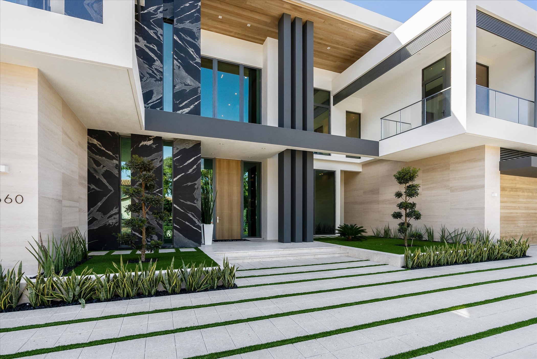 This stunning coastal modern estate features a striking white stucco façade with natural wood and black marble accents, blending modern design with warm, luxurious finishes. Inside, soaring ceilings, wide-plank oak floors, and a dramatic vertical wood installation create a captivating architectural statement.