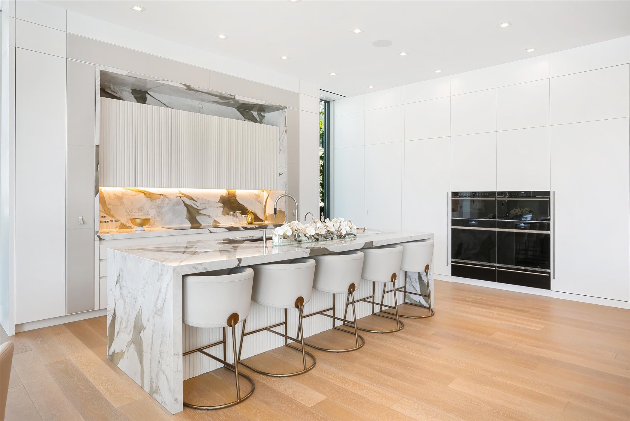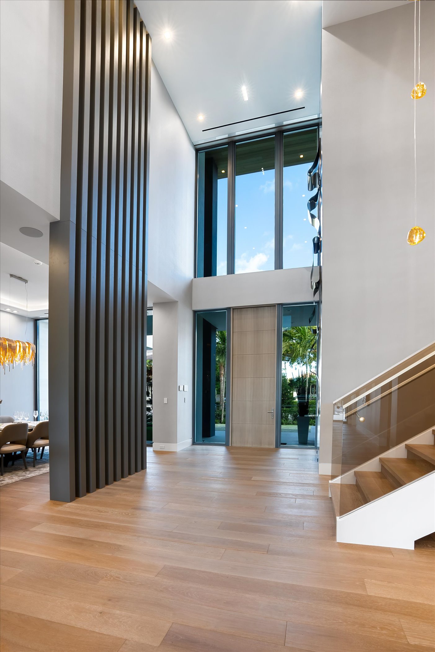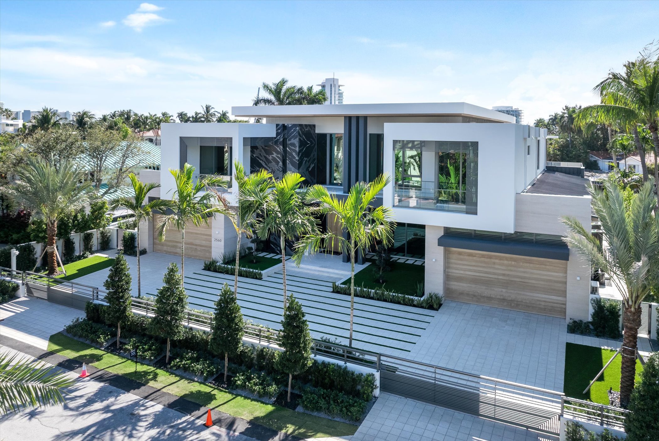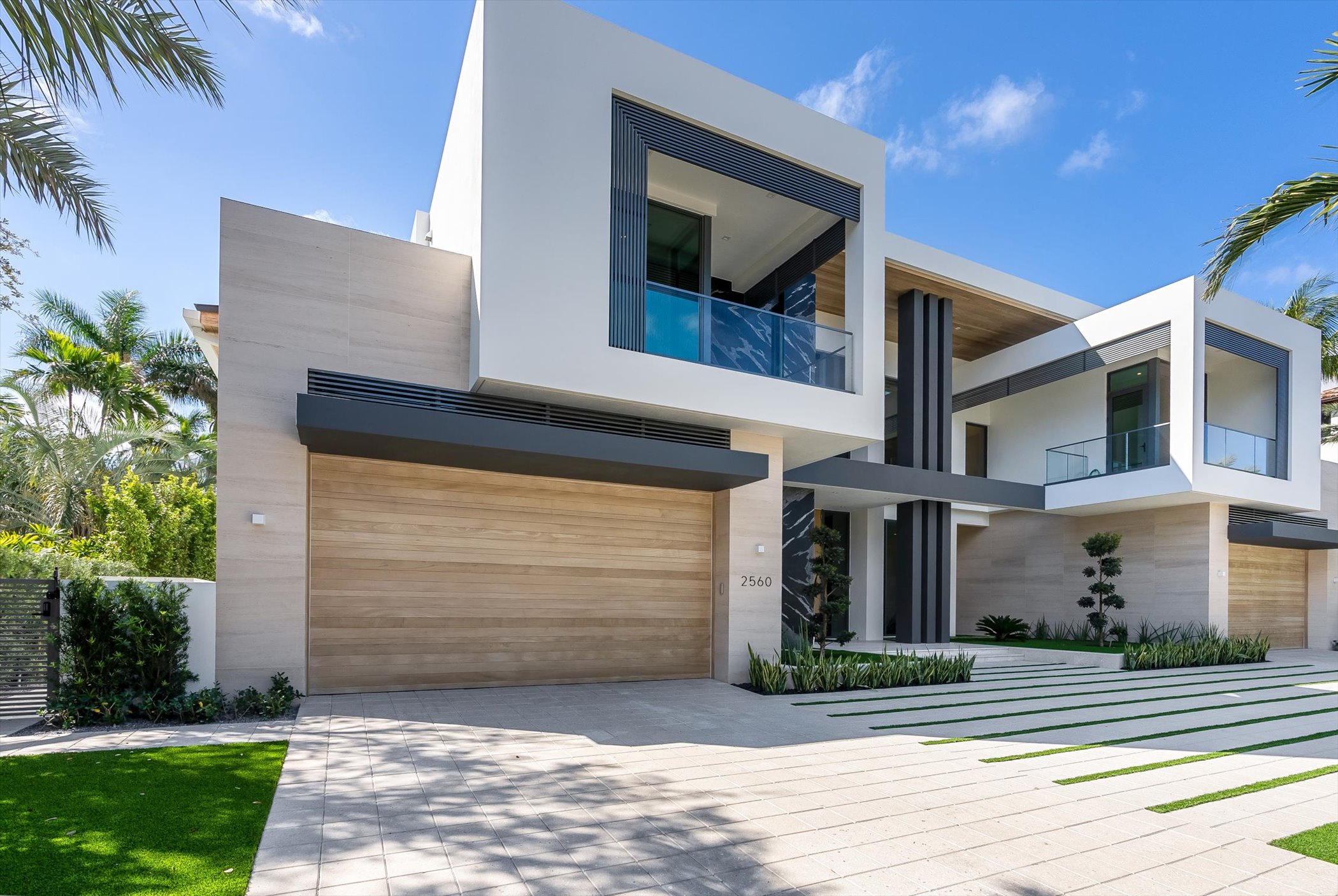This stunning coastal modern estate features a striking white stucco façade with natural wood and black marble accents, blending modern design with warm, luxurious finishes. Inside, soaring ceilings, wide-plank oak floors, and a dramatic vertical wood installation create a captivating architectural statement.