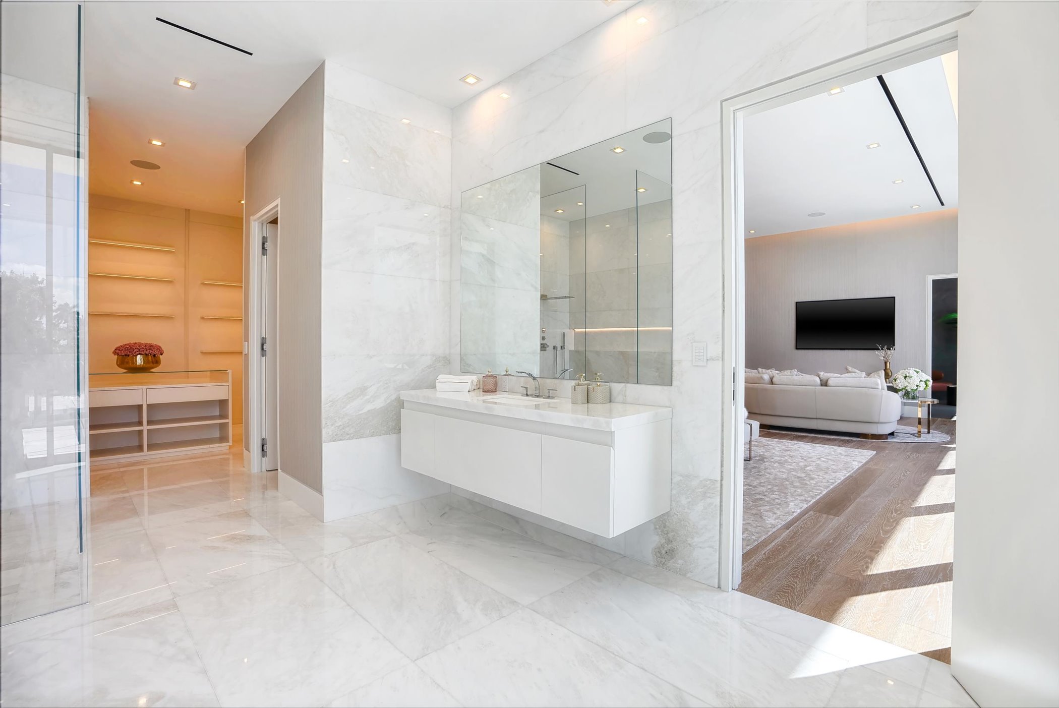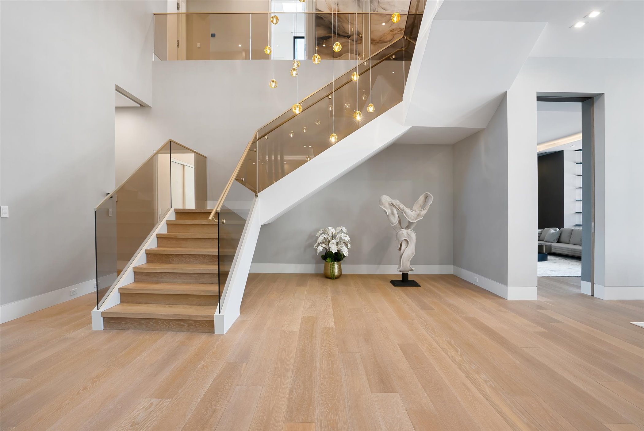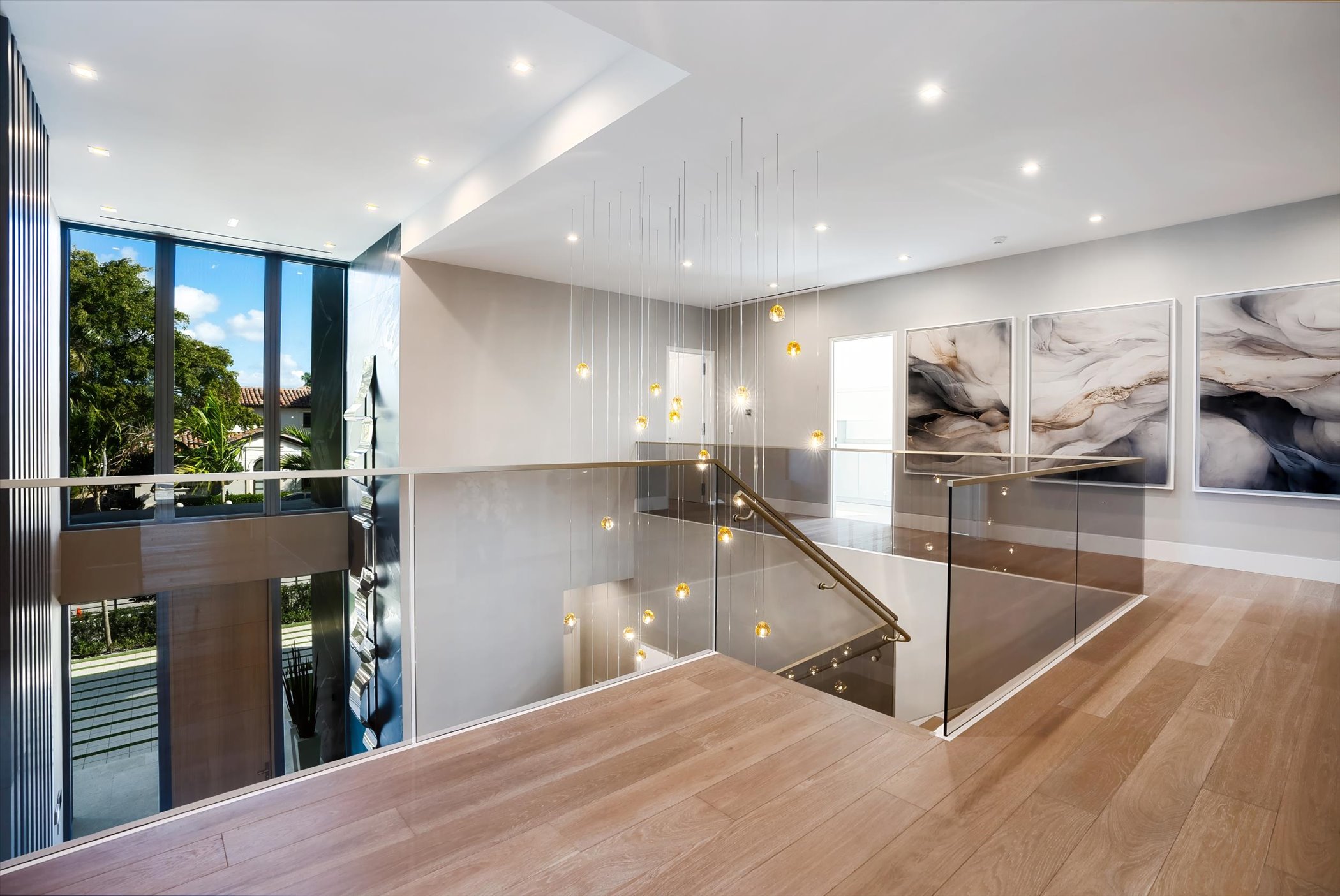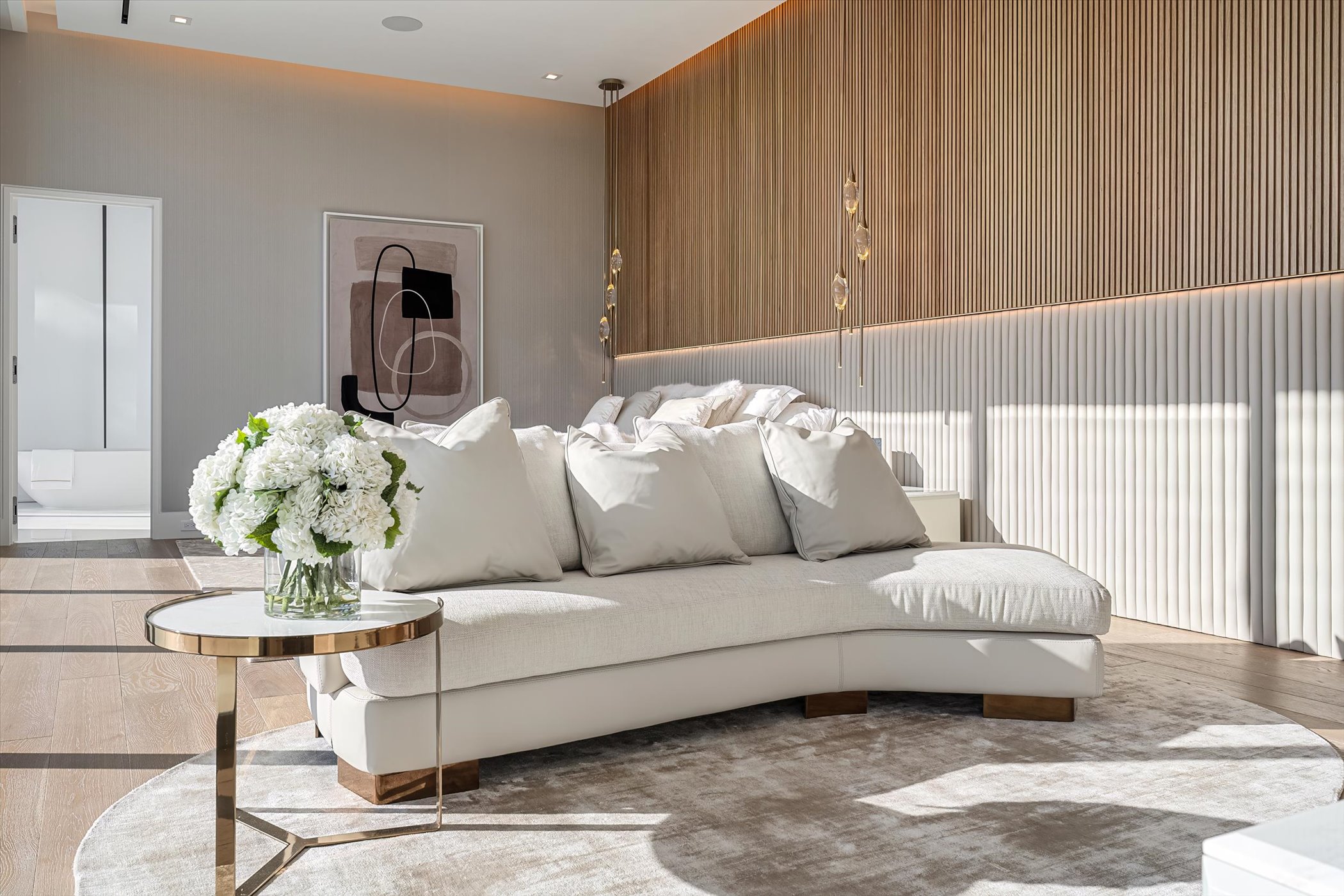 This stunning coastal modern estate features a striking white stucco façade with natural wood and black marble accents, blending modern design with warm, luxurious finishes. Inside, soaring ceilings, wide-plank oak floors, and a dramatic vertical wood installation create a captivating architectural statement.