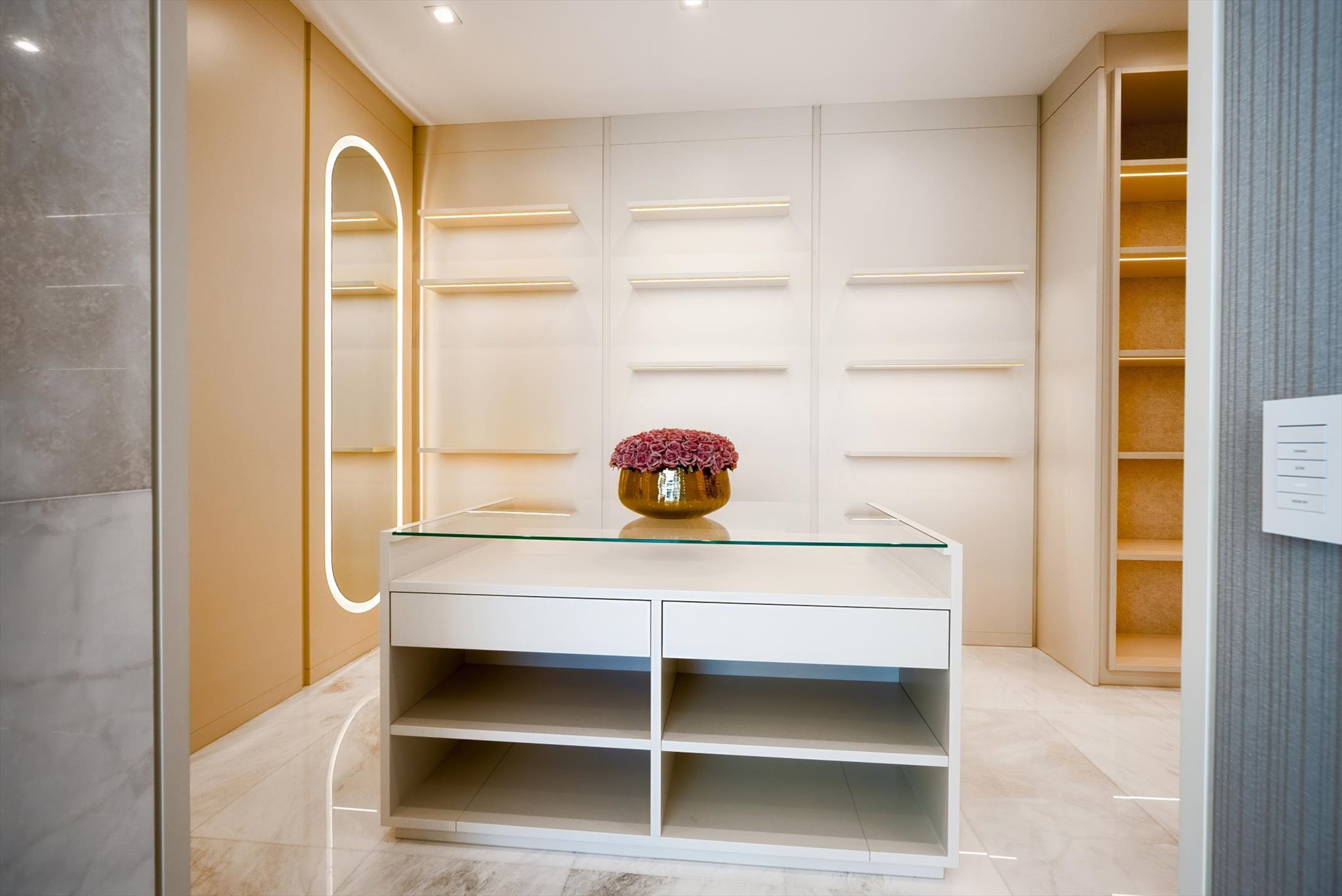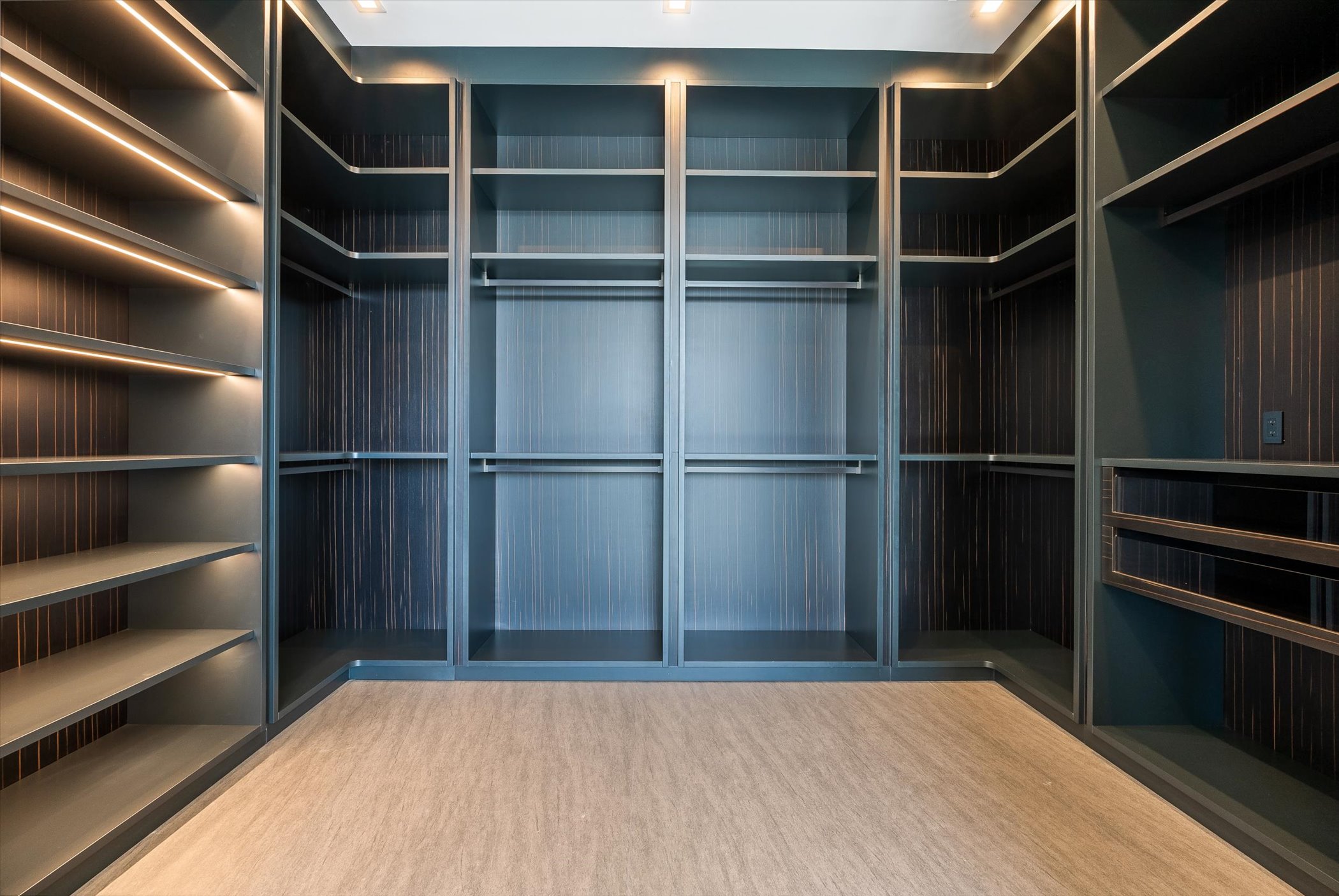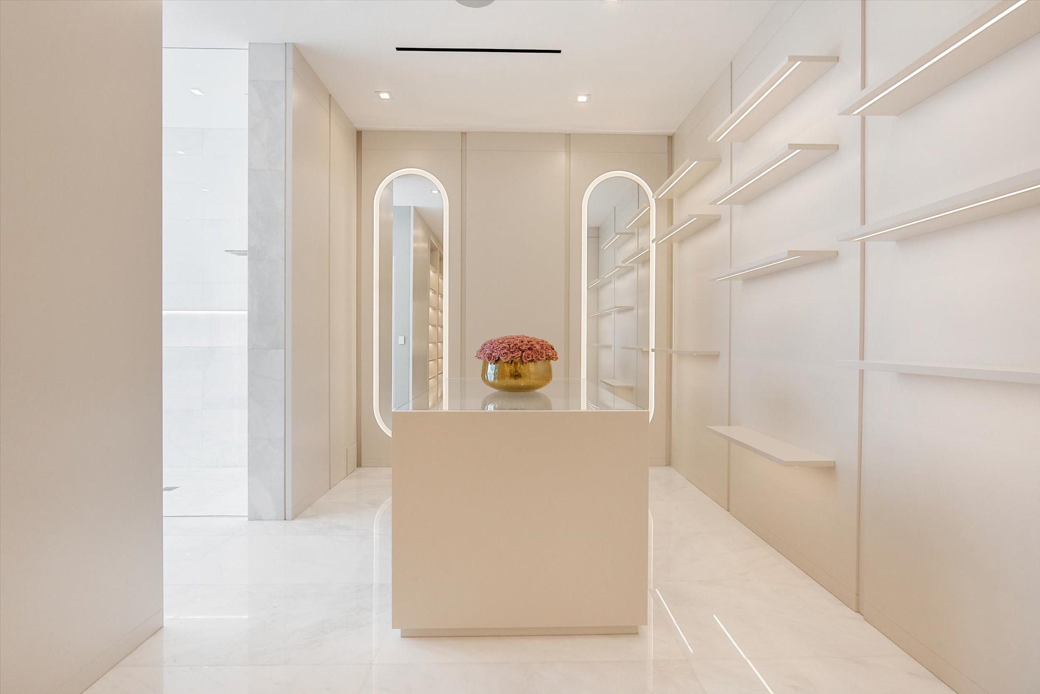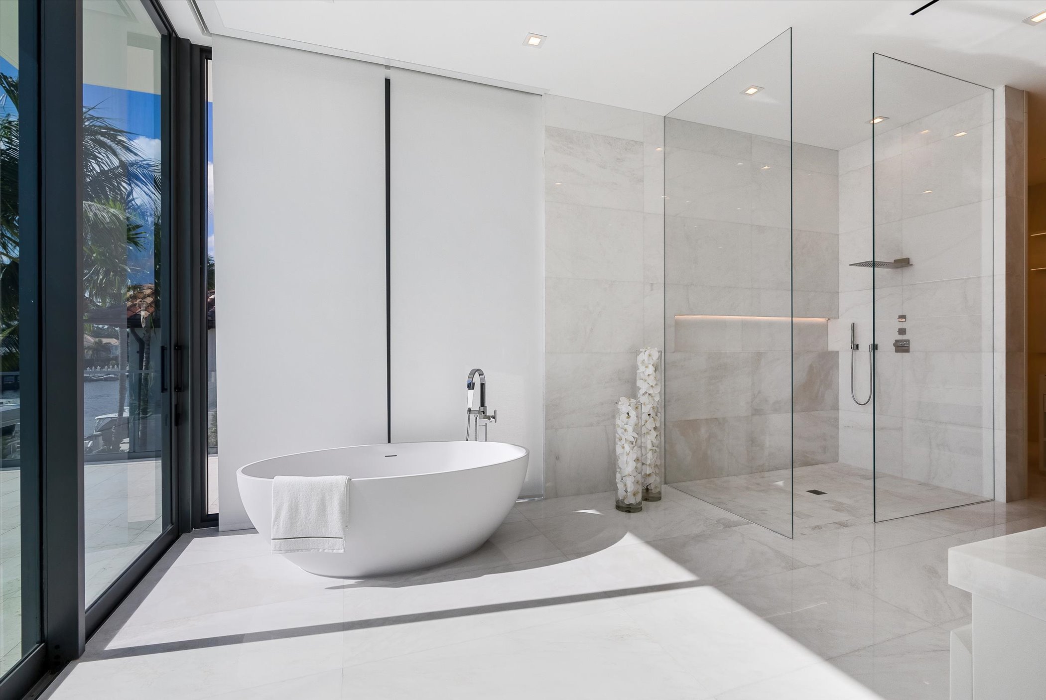 This stunning coastal modern estate features a striking white stucco façade with natural wood and black marble accents, blending modern design with warm, luxurious finishes. Inside, soaring ceilings, wide-plank oak floors, and a dramatic vertical wood installation create a captivating architectural statement.