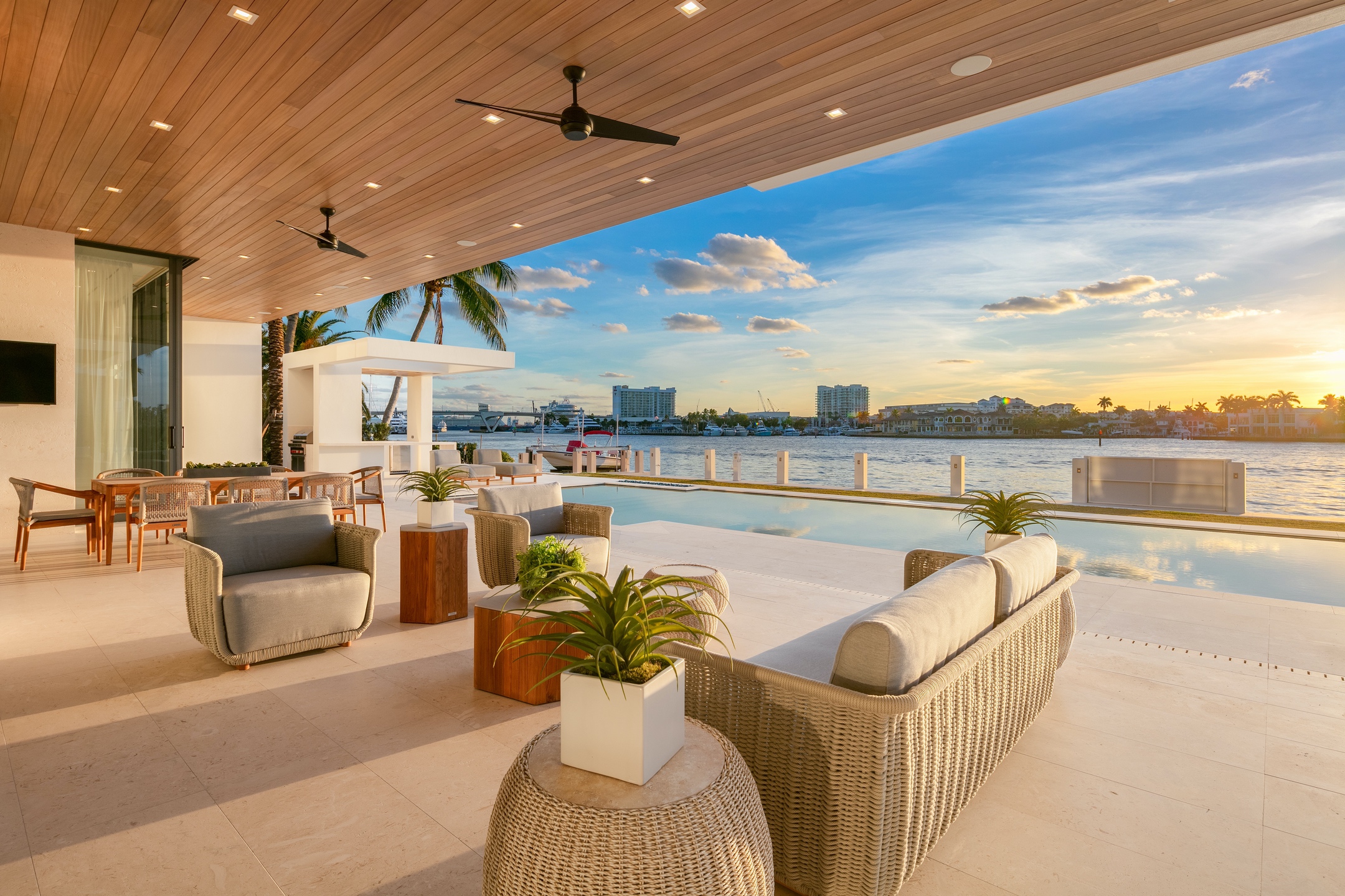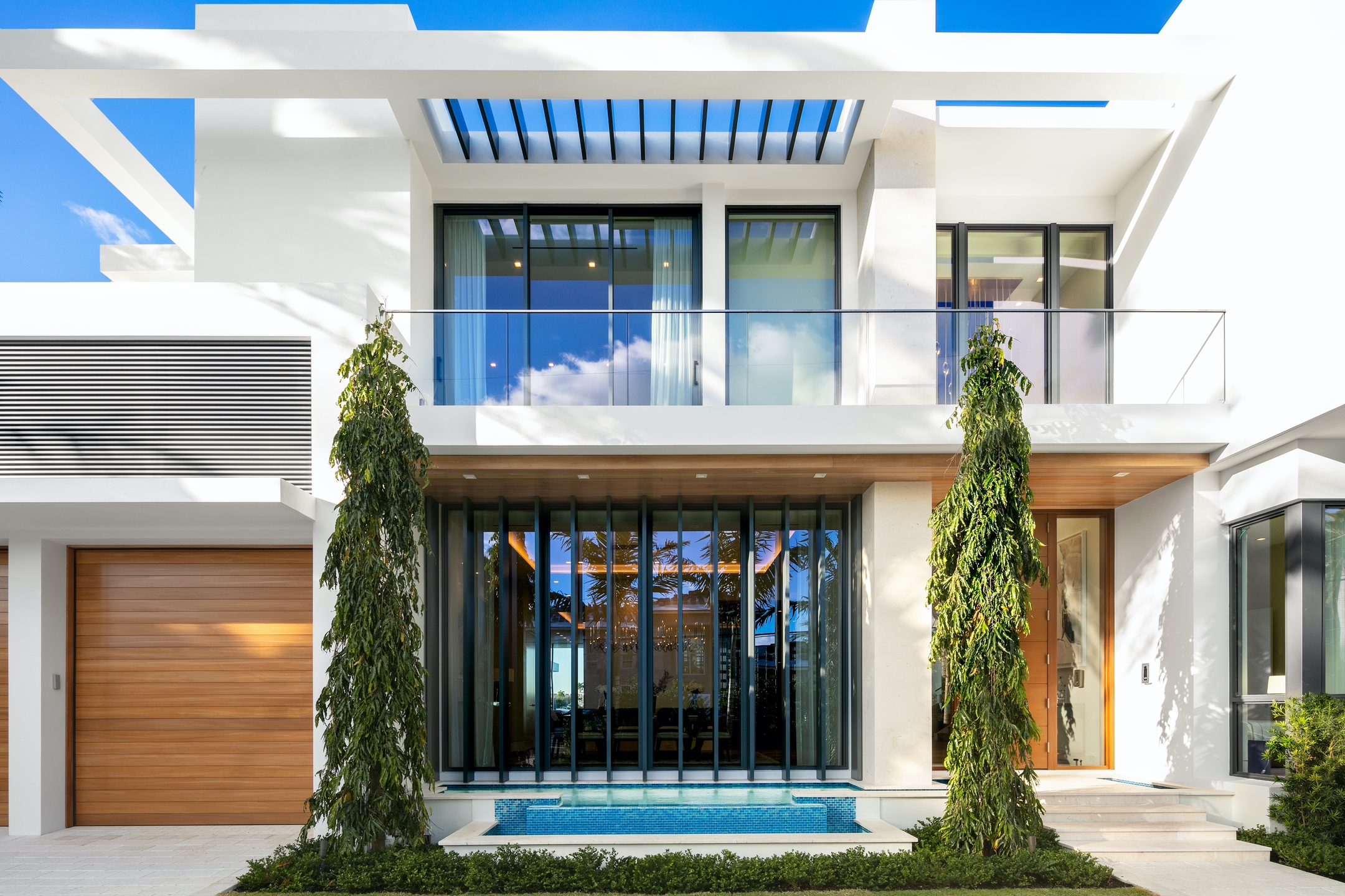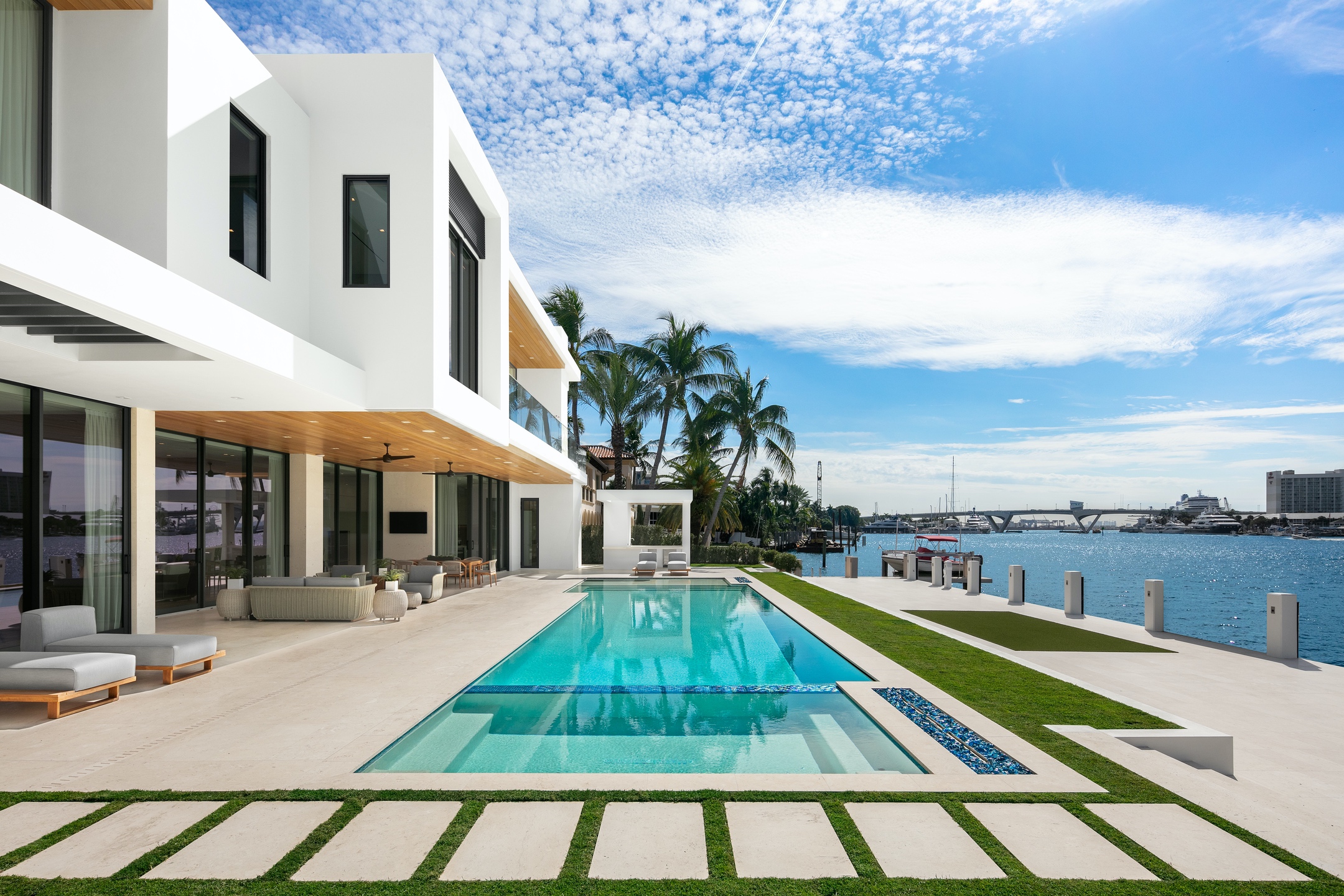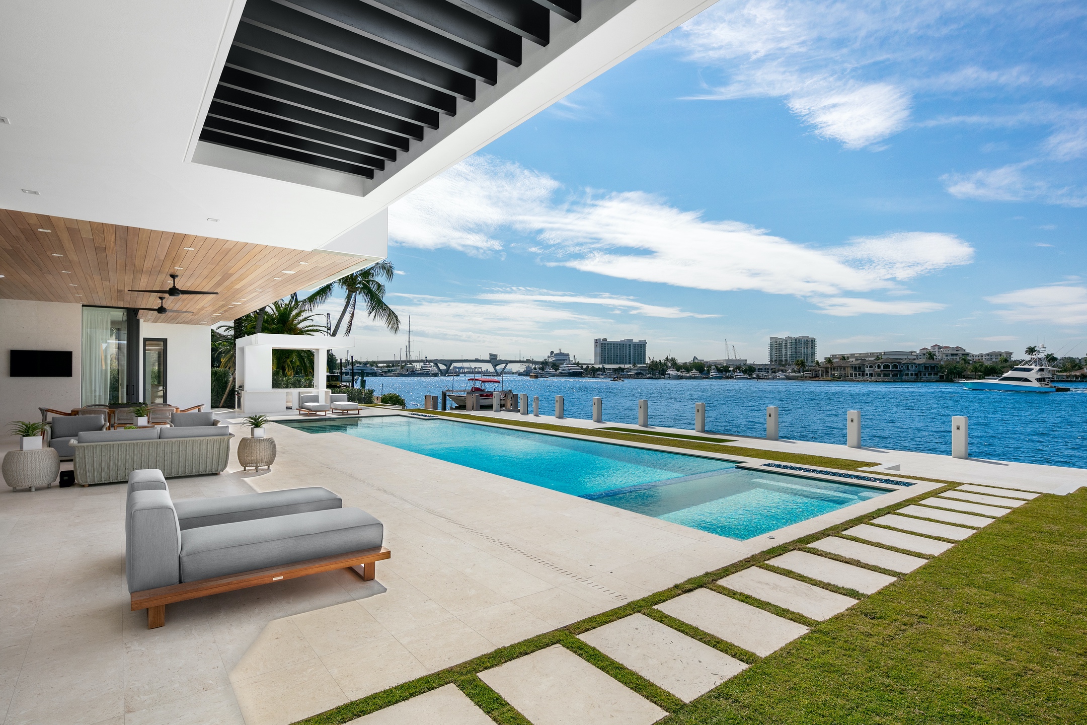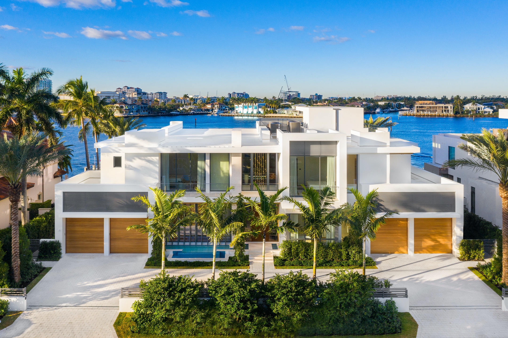 Commanding 120 feet of prime deep-water frontage, this exceptional estate in the exclusive Harbor Beach community offers panoramic views and direct ocean access. Encompassing over 9,400 square feet, the home blends clean modern architecture with warm natural materials and walls of glass that blur the line between indoor and outdoor living.