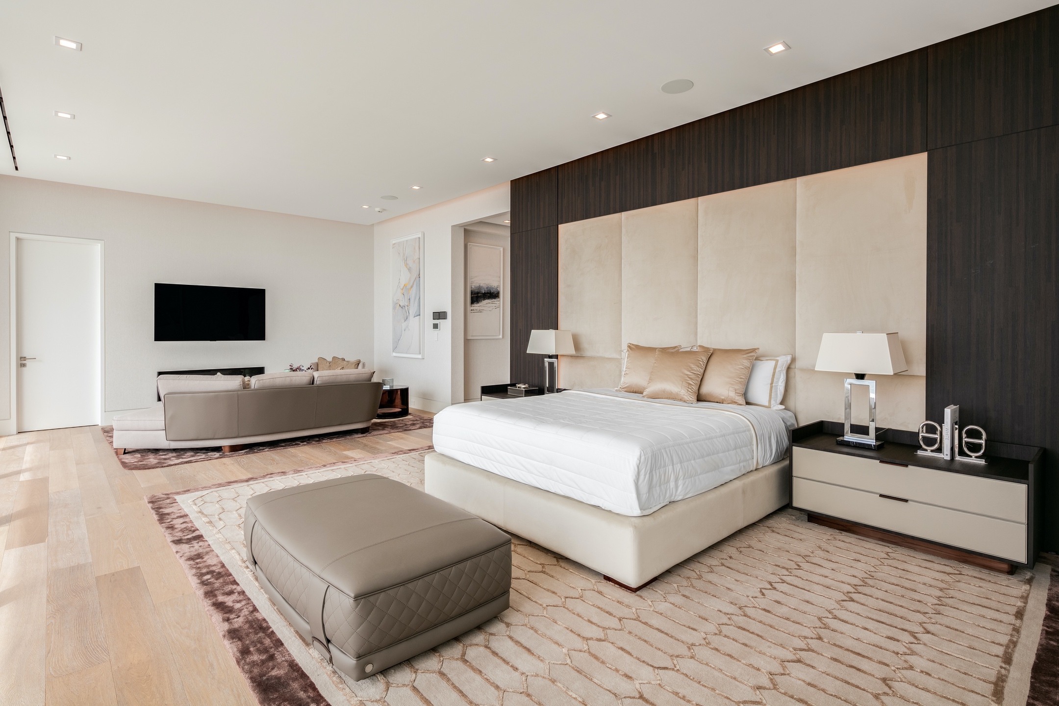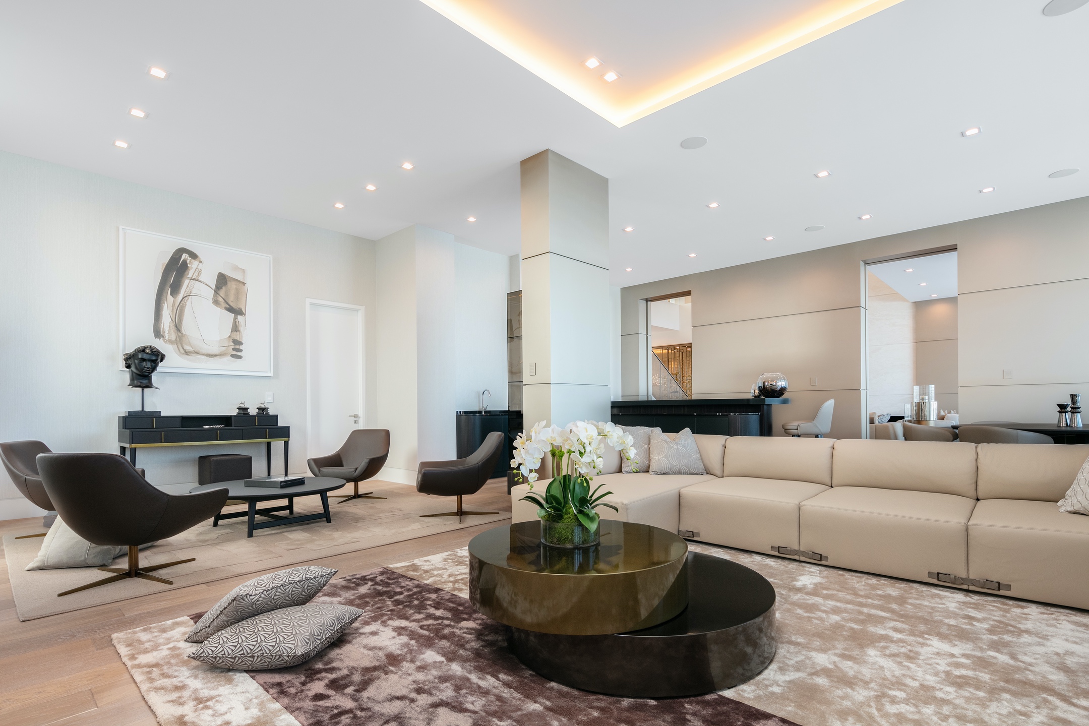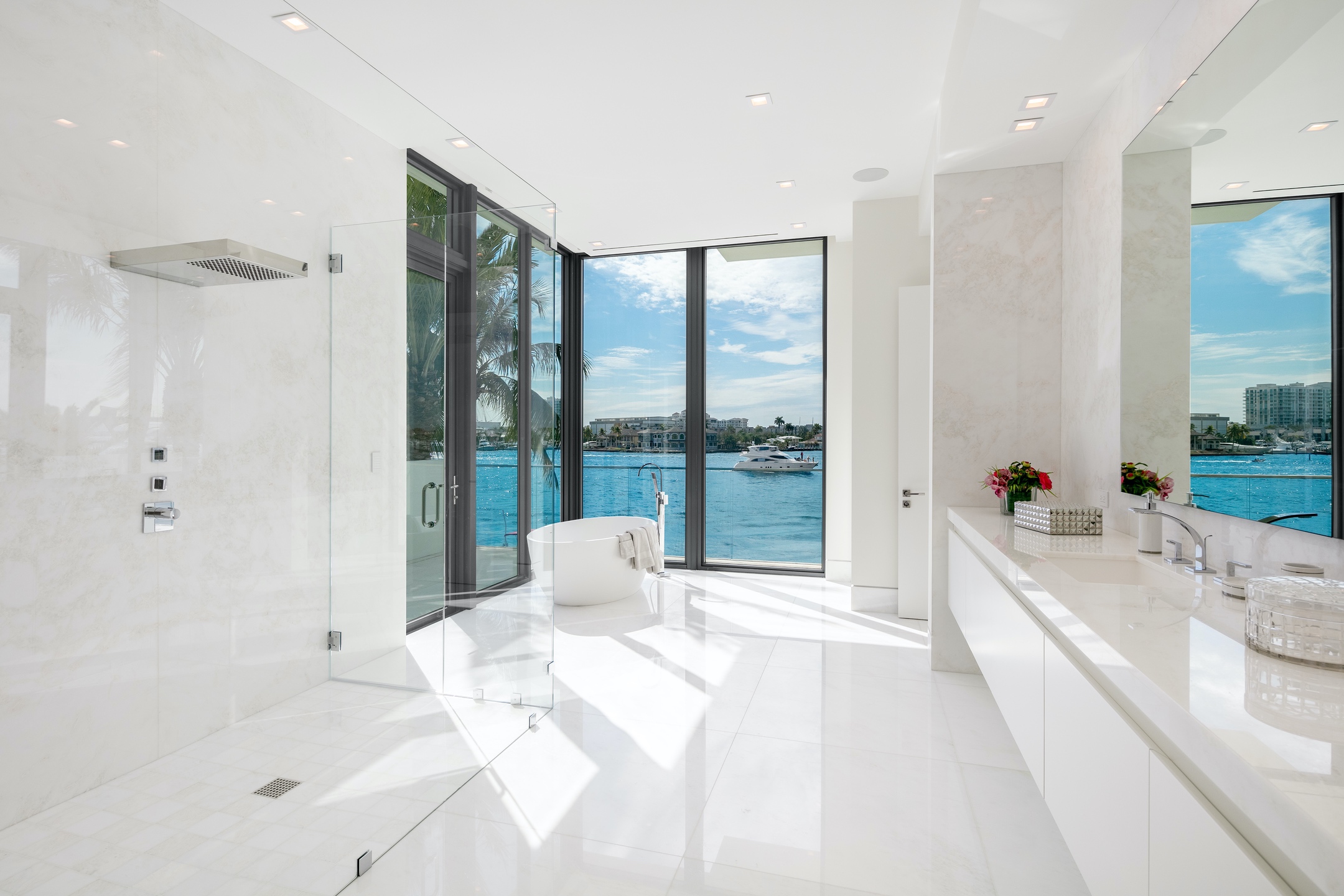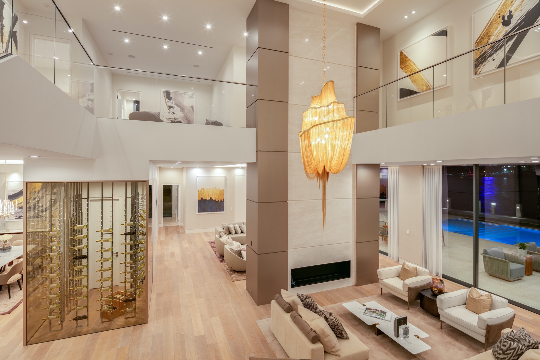 Inside, curated finishes like European oak floors, a dramatic two-story marble fireplace, and custom Italian cabinetry define sophisticated living. The spa-like primary suite features floor-to-ceiling water views and a marble-clad bath that rivals five-star resorts.